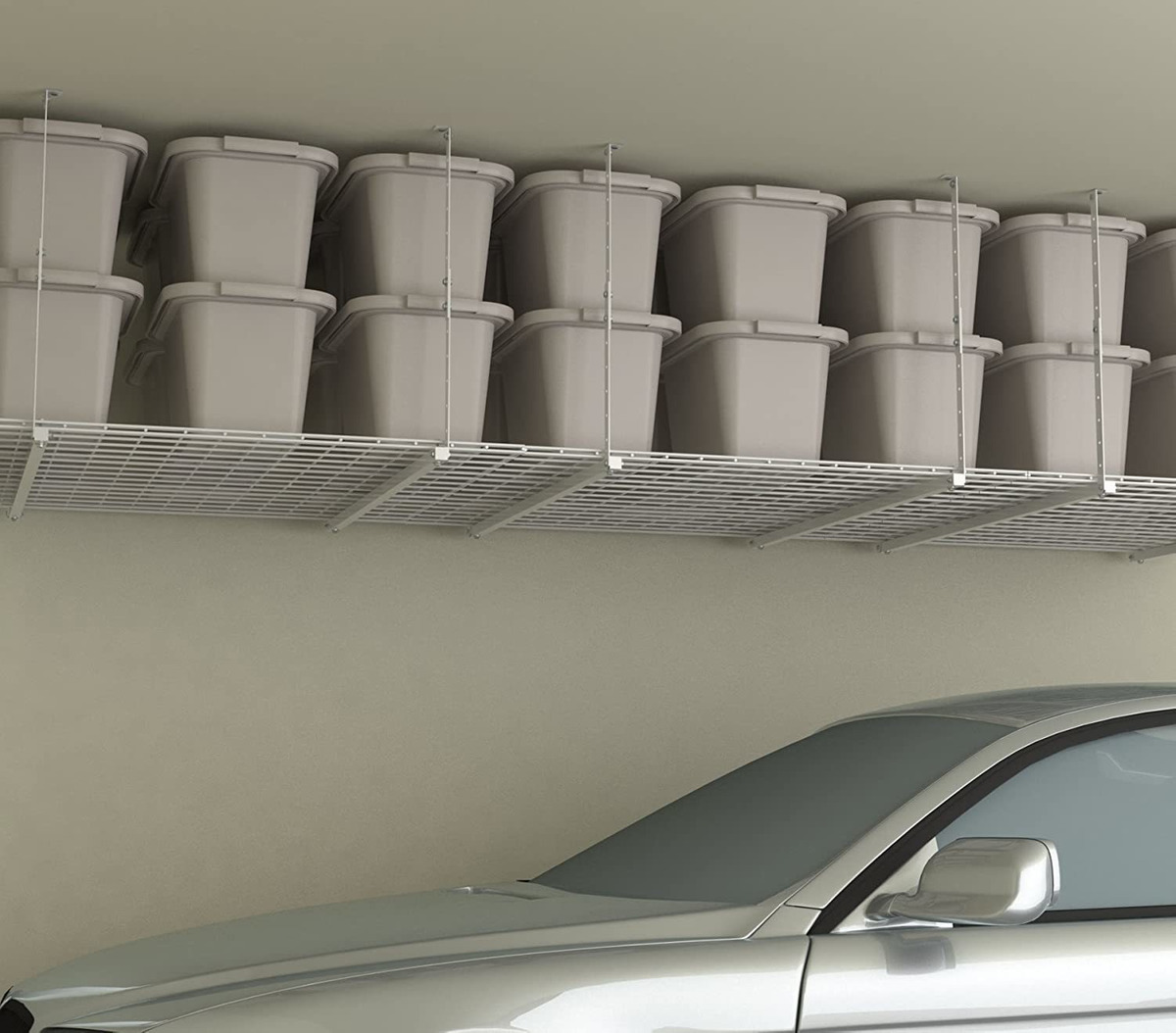 Estante colgante de techo de altura ajustable, ideales PARA USO interior o clóset ONU .; 27 x 36 Pulgadas de Espacio de Almacenamiento con 150 un 200 lbs de Capacidad de Carga .; Acabado en Acero Que Previene el óxido o arañazos .; Se Puede Conectar una ONU Acabado o techos sin terminar .; Fit de altura de 16 a 24 Pulgadas. Tamaño: 45 X 45