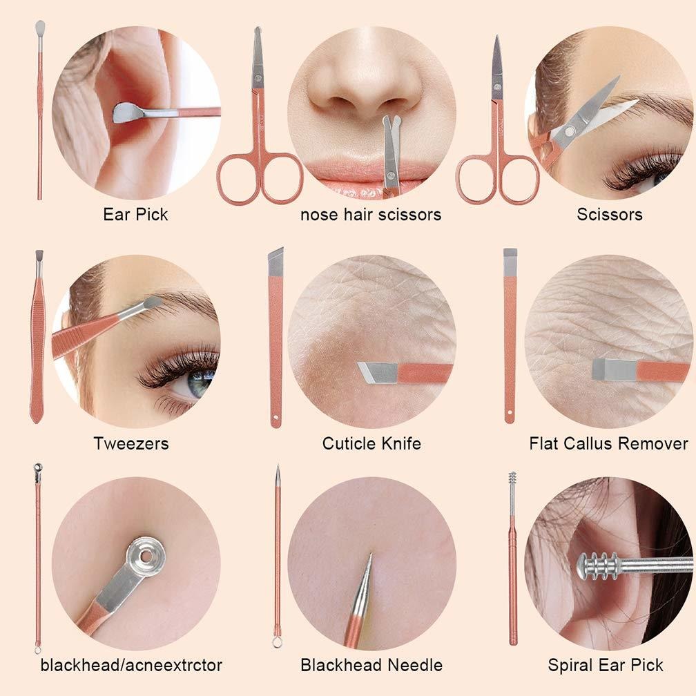 Multi-funcional El kit de uñas portátil contiene todas las herramientas que se necesitan, tiene una variedad de funciones, incluyendo cuidado de las manos, cuidado facial y cuidado de los pies. Manicura, pedicura, formar de la ceja, / blackhead acné eliminación etc, sólo que con un juego y todo hecho; Fácil llevar El conjunto de las mujeres manicura viene con un estuche de cuero de la PU portátil. Que puede proteger, almacenar sus herramientas y les impiden la pérdida. Este conjunto de todo mantener limpio y organizado, lo suficientemente pequeño como para caber en cualquier bolso o bolsa, ideal para los viajes y la vida cotidiana; Regalos Cuidado Personal Mejor juego de pedicura profesional personal con el caso de cuero de la PU hermoso y elegante, único y funcional, el conjunto de manicura pedicura es también el mejor regalo para la esposa, novia, madre; 18 en 1 kit de uñas La manicura kit incluye pinzas, tijeras, pinzas de la cutícula, tijeras de pelo de la nariz, uñas de los pies podadoras, cortaúñas, inclinado cortaúñas borde, lima de uñas, callos plana removedor, cuchillo de la cutícula, cuchillo de pedicura, empujador de la cutícula, muertos tenedor de la piel, los condensadores de ajuste de la cutícula, selección espiral oído, la aguja de la espinilla, selección del oído, de la espinilla / acné extractor; Servicio garantía de devolución de dinero de 30 días. Si no lo hace como nuestro kit de aseo personal, por favor no dude en ponerse en contacto con nosotros a través de correo electrónico, vamos a resolver el problema para usted en 24 horas hasta que esté satisfecho. Color: oro rosa