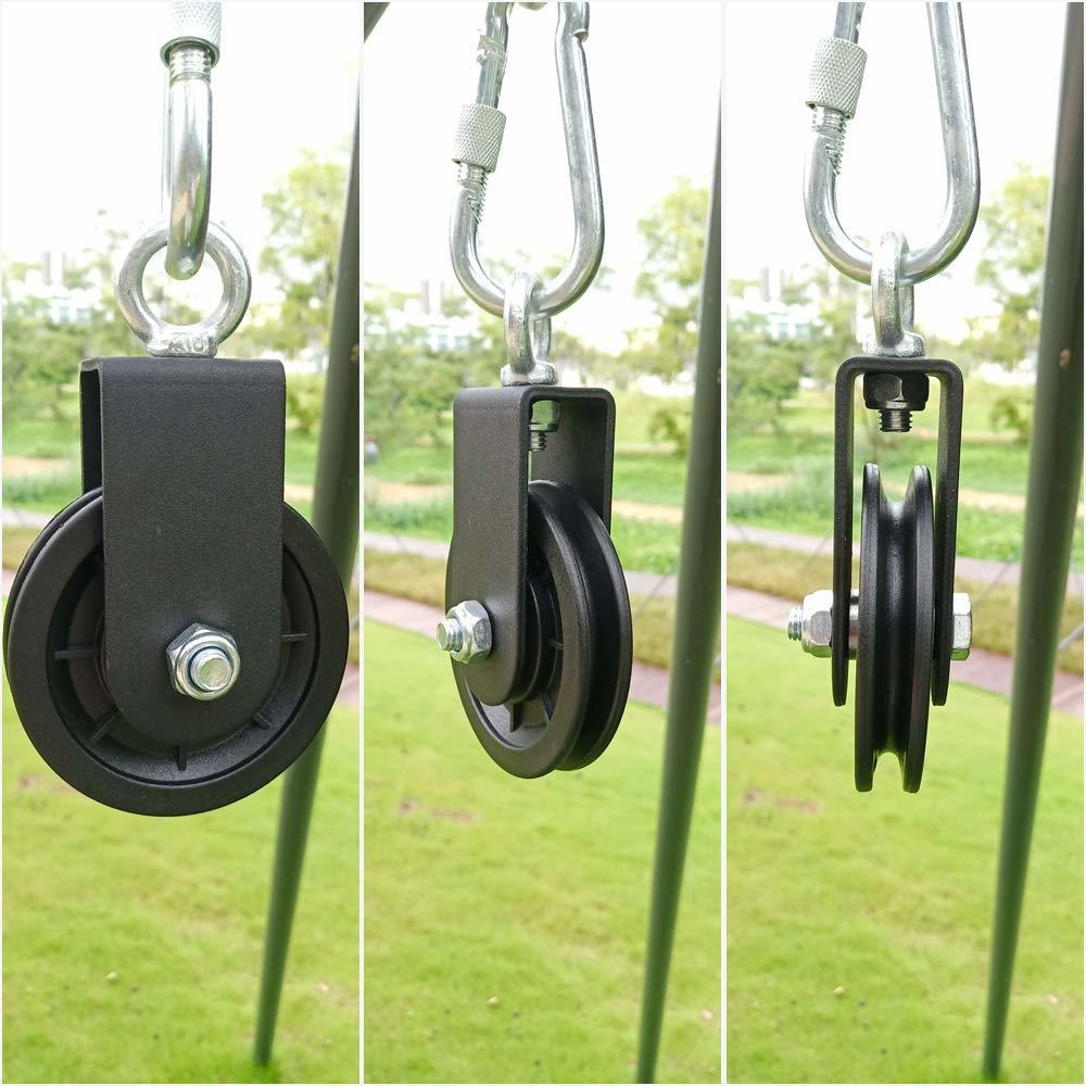 Easy instalación- Cable Polea adopta tornillo de auto-bloqueo para bloquear el eje de rotación, la tuerca no es fácil para aflojar, instalación sistema de polea giratoria es simple y conveniente. la polea puede llevar a 350 libras / 160 kg, para el cable y el alambre con un diámetro de hasta 8 mm / 0,31 en .; Super mudo-Polea es muy suave sin ruido a ella cuando se utiliza. cojinetes Polea de bolas de acero de bloque de carbón dentro de la polea, lo que puede reducir la fricción de la rueda. La polea gira de manera más flexible y tiene.; Prevent oxidación de diámetro de la polea de 90 mm es de un material de nylon reforzado, suave y resistente, óxido – prueba, la corrosión – uso resistente, al aire libre también puede prevenir la corrosión polea .; Rueda Security-polea en la parte superior de la rueda de elevación está conectado con el orificio de hoja de metal con tuerca autoblocante., Girar 360 grados pueden garantizar la seguridad .; Apply-Polea Ampliamente utilizado para la tracción de la cuerda de alambre, gimnasio en casa, Adjunto de bricolaje para el sistema de gimnasio en casa polea, bloques de elevación, grúas, elevación escala, gimnasio equipo, tendedero Especificación