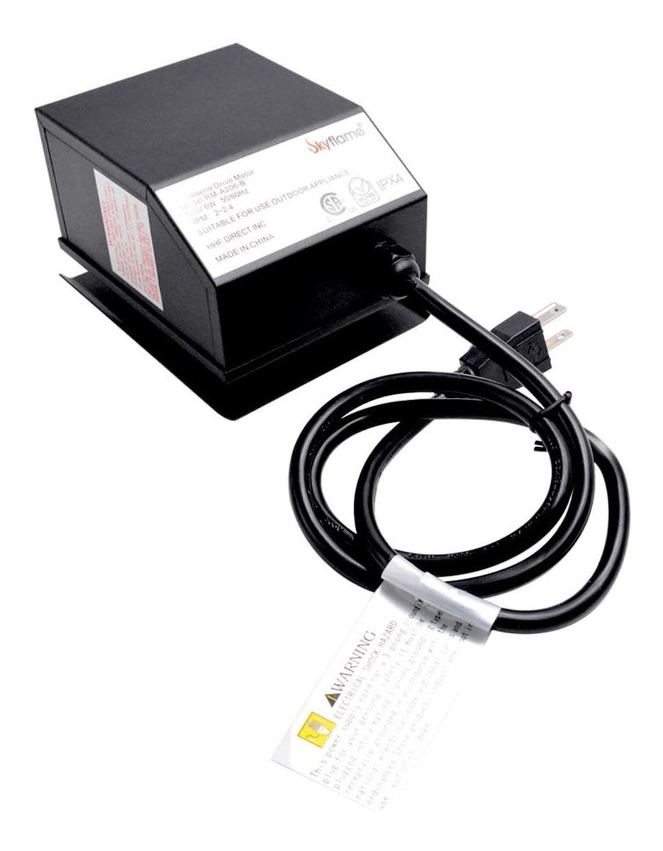 Motor de accionamiento de asador al aire libre 120 voltios 6 vatios: 50/60Hz rpm: 2-2.4 e interruptor de encendido/apagado resistente al agua.; Acepta varillas de giro de 5/16 pulgadas y cable eléctrico de 36 pulgadas con conexión a tierra de tres puntas para uso con enchufes estándar de 120 V o cables de extensión al aire libre. Para mayor seguridad, los cables eléctricos deben mantenerse en contacto directo con una parrilla caliente.; Acero inoxidable recubierto con pintura de alta temperatura, carcasa resistente a la intemperie con ventilación integrada que proporciona protección contra pequeñas interrupciones climáticas durante el uso y para un fácil mantenimiento y limpieza.; El motor de accionamiento de asador Skyflame ha sido fabricado con materiales y componentes de primera calidad para garantizar que tu experiencia de asado sea insuperable y durará mucho tiempo.; Una excelente actualización para muchas principales marcas de parrillas: Weber, Char-Broil, GrillPro, Brinkmann, Onlyfire etc. Todos nuestros productos estan en inglés SKU 4022229729