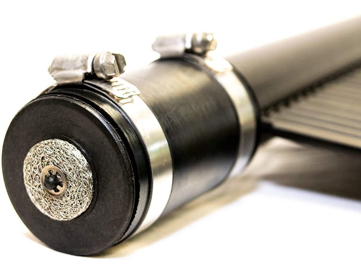 Normalmente se instala con un conector de manguera de goma y abrazaderas de manguera, que se venden por separado.