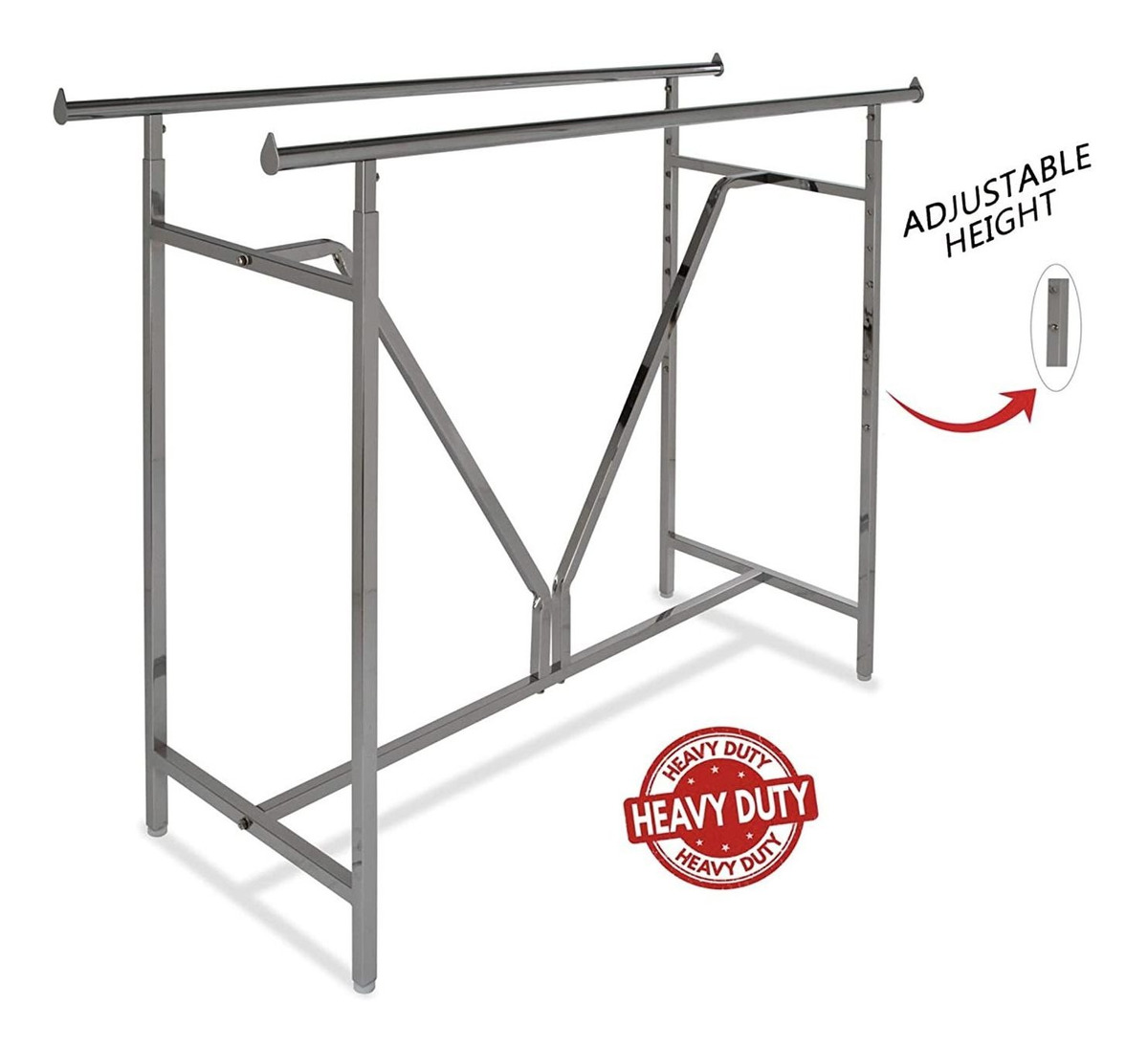 También conocido como bastidores caja o bastidores H, el doble estante de ropa bar es el caballo de batalla para el minorista de ropa. Lo más a menudo utilizado por las tiendas de descuento que desean maximizar la cantidad de inventario en el suelo, los bastidores de doble barra están diseñados para contener un gran número de prendas en dos lados. Este V Brace cremallera de doble barra ajustable para prendas está acabado en cromo y cuenta con montantes robustos hechas de 1 tubería cuadrada y hangrails hechas de 1 tubo redondo. Proporciona el doble de espacio de exhibición para colgar prendas de vestir, ideal para cualquier entorno de tienda al por menor. altura Hangrail es ajustable cada 3 de 48 a 81 . Refuerzo de diseño V corsé da este estante fuerza superior sobre bastidores en tándem de prendas de vestir similares. niveladores ajustables incluidos. Todos nuestros productos estan en inglés SKU 6102030989
