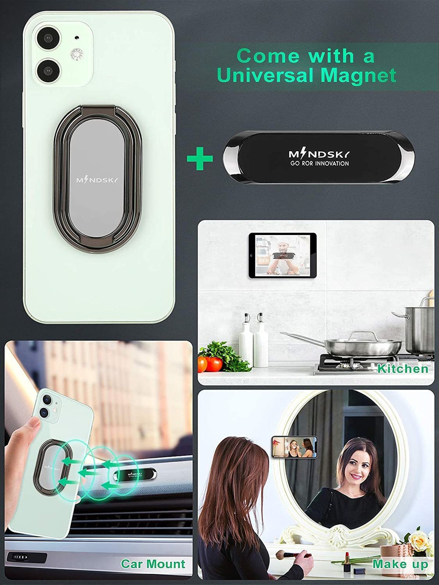 Agarre de anillo y soporte de mesa 2 en 1: el diseño de doble plegado proporciona infinitas posibilidades. El anillo de agarre puede adaptarse perfectamente a diversas ocasiones, evita que tu teléfono se resbale de las manos en autobús y metros llenos. Asegura tu teléfono para caminar, viajar, senderismo, jugar a juegos, selfies con una sola mano. También es una solución perfecta para colocar tu smartphone en el escritorio de la oficina, encimera de la cocina o mesita de noche.; Diseño flexible multiángulo: rotación de 360 y 2 brazos ajustables hacen que sea más cómodo para proporcionarte más ángulos de visión que cualquier otro soporte de anillo de teléfono celular o soporte de teléfono. El anillo de dedo del teléfono está probado para soportar 10.000 veces de plegado sin que se suelte.; Material de alta calidadEl soporte para teléfono está hecho de material de aleación de zinc de alta calidad, cuenta con su ultra durabilidad que mantiene los colores frescos y sin decoloración como nuevos incluso después de usarlo durante mucho tiempo. Con cinta adhesiva 3M potente que se fija bien a smartphones, tabletas, Kindles y Switch Lite. Proporcionaremos un disco electrostático, ayudando a pegarlo firmemente en plástico liso, TPU, metal o la mayoría de fundas de teléfono/teléfono. No se pega a tela, vidrio, silicona líquida o superficies con textura no planas.; Juego de combinación de agarre y soporte magnético: el paquete incluye un soporte de anillo para teléfono celular y un soporte magnético para teléfono para coche. Este potente soporte magnético para teléfono es compatible con varios modelos de coche y también se puede utilizar en cocinas, oficinas, armarios y otros escenarios. Puedes simplemente colocar o quitar tu teléfono con una mano y evitar que el teléfono se caiga cuando conduces en una carretera de montaña difícil.; No te preocupes: si hay cualquier problema de calidad con este soporte para smartphone, no te preocupes. Proporcionaremos un servicio de atención al cliente oportuno las 24 horas x 7 días para resolver el problema mejor. Si no te gusta el agarre del teléfono por cualquier razón, te devolveremos o lo reemplazaremos. Todos nuestros productos estan en inglés SKU 91221081831
