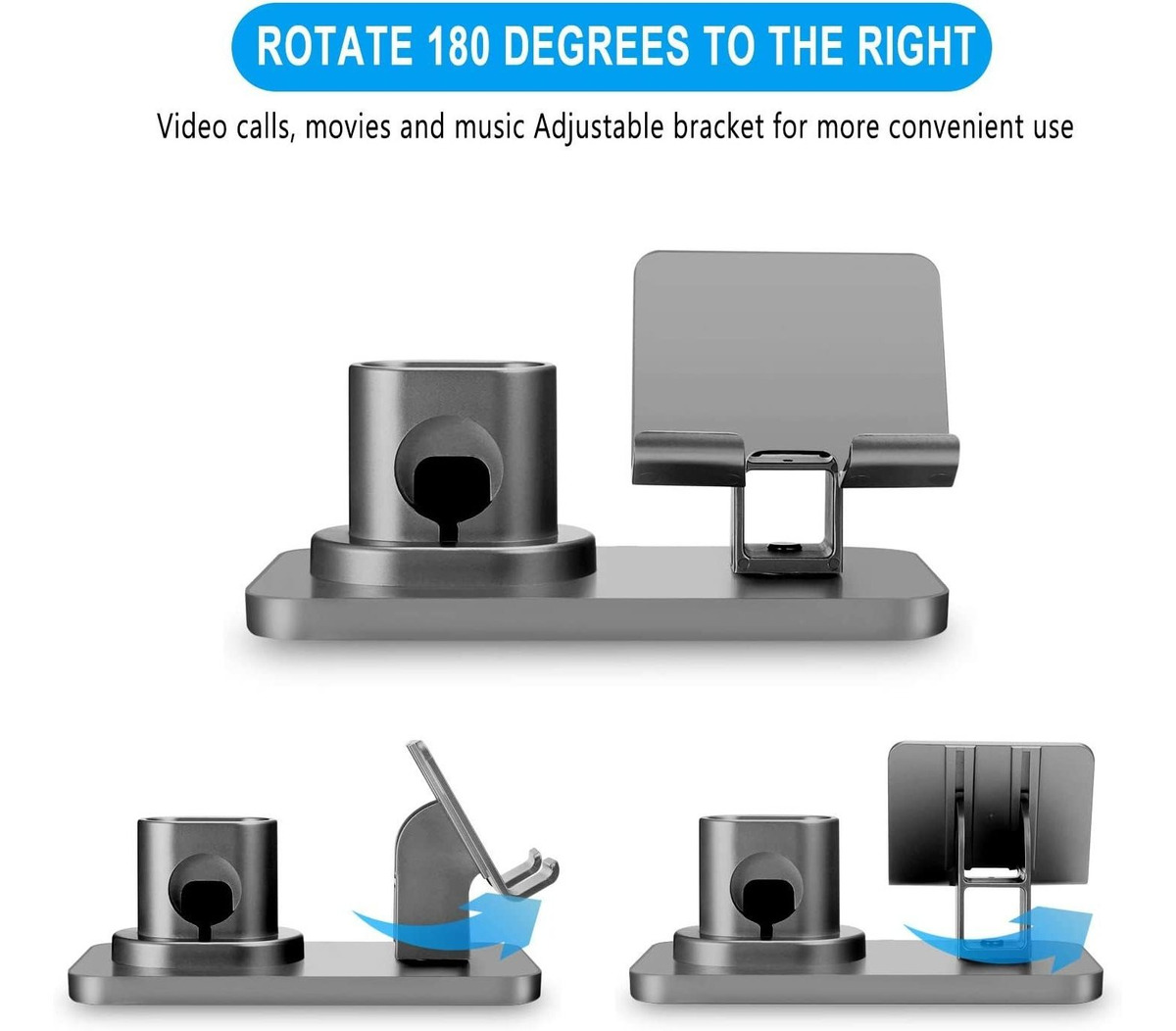 Diseño y materiales: este soporte de carga 3 en 1 para teléfono celular es el último diseño de 2019. El soporte para teléfono se puede girar 180 para teléfonos móviles o iPad más grandes. Marco rígido de policarbonato de alta calidad hecho de policarbonato de plástico duro resistente de alta calidad y goma suave para un uso estable en cualquier situación. La goma en la parte inferior no solo evita que el soporte se deslice, sino que también protege la superficie de la mesa. Exquisita artesanía y estructura perfecta.; Estructura e instalación: este soporte de carga 3 en 1 es muy cómodo de instalar. Simplemente enrolla los cables del iWatch y los AirPods y guárdalos perfectamente en el compartimento de almacenamiento en la base, puede ocultar y proteger tu cable de carga muy bien, puedes ahorrar espacio en el escritorio; Uso y protección: iwacth y AirPods utilizan un soporte de carga tipo asiento. Después de fijar el cable de carga, coloca el reloj y los AirPods directamente para cargar. Es muy seguro, y la ligera inestabilidad no hará que el dispositivo se deslice o se rompa. El soporte para teléfono es de 3.1 in / 0.8 in de alto y 0.8 in de ancho en la parte inferior, lo que hace que tu teléfono o iPad sea más estable.; Escenarios aplicables: ángulo de visión perfecto de 60 y rotación de 180 para más comodidad en tus programas de cocina, películas, programas de televisión, escuchar canciones y aplicaciones en vivo, leer mensajes y juegos. Adecuado para mesitas de noche, cocinas, mesas de comedor, oficinas, escritorios, salas de estar y mucho más.; Compatibilidad y consejos: soporte de carga 3 en 1 para cargador Apple Watch1/2/3/4, AirPods 1/2, IphoneX/Xr/Xs/XsMax/7P/8P, Samsung Galaxy S9/S9 /S8/S8/ S7/Note 8/Note 9/Note10 todos los smartphones y iPad (0-10 pulgadas). Consejo: este producto no está equipado con ningún dispositivo de carga. Color:Gris