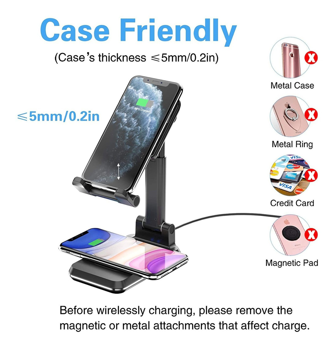 1 año de garantía y amplia compatibilidadEste soporte de carga inalámbrico Qi 2 en 1 es compatible con todos los dispositivos habilitados para Qi, carga rápida de hasta 10 W para Samsung Galaxy S20, S10, S10, S10E, Note 9, S9, S9 Plus, Note 8. 7,5 W para iPhone SE2020/11 Pro Max/11 Pro/11/X/XS/XS Max/XR/8/8 Plus y carga inalámbrica estándar de 5 W para AirPods Pro, Galaxy buds y otros dispositivos habilitados para Qi como Google Pixel 3/3XL/4XL y así sucesivamente.; Modo de carga horizontal y vertical: este soporte de carga dual inalámbrico para 2 dispositivos habilitados para Qi, soporta cargar dos teléfonos simultáneamente hasta 10 W debido al enchufe QC 3.0 incluido. La bobina ampliada hace que sea posible cargar en orientación horizontal mientras ves vídeos, o en modo vertical para mensajería y reconocimiento facial. Puedes cargar el teléfono vertical u horizontalmente como quieras.; Plegable y con ángulo y altura ajustable: el diseño plegable hace que sea conveniente para llevarlo a cualquier lugar. Ángulo y altura ajustable, puedes ajustar el ángulo o la altura de acuerdo a tus necesidades. Fácil de usar, simplemente coloca tus dispositivos con una alineación precisa, incluso con fundas adicionales ( 0.197 in). Las luces indicadoras suaves nunca te molestarán. Luz verde cuando está en espera, luz azul cuando se carga, luz roja cuando está completamente cargada, luz roja y azul parpadean cuando el FOD afecta.; Protección de seguridad avanzada: hecho de material ABS de alta calidad y policarbonato y aleación de aluminio. Los chips inteligentes en el interior reconocen y ofrecen eficiencia de carga específica para diferentes dispositivos. Los chips proporcionan sobrecarga, sobrecorriente, sobretensión, control de temperatura, prevención de cortocircuitos, protección contra sobretensiones y mucho más. Protégete a ti mismo y a tus dispositivos todo el tiempo. Ofrecen un mejor rendimiento de radiación que otros.; El mejor regalo de Navidad para familiares y amigos: 1 soporte de carga inalámbrico, 1 cargador de pared rápido 3.0, 1 cable de carga USB-C de 3.3 ft, 1 manual de usuario (no es necesario comprar accesorios adicionales). Si tienes algún problema, no dudes en ponerte en contacto con nosotros en servicecosoos.com Todos nuestros productos estan en inglés SKU 91221080646