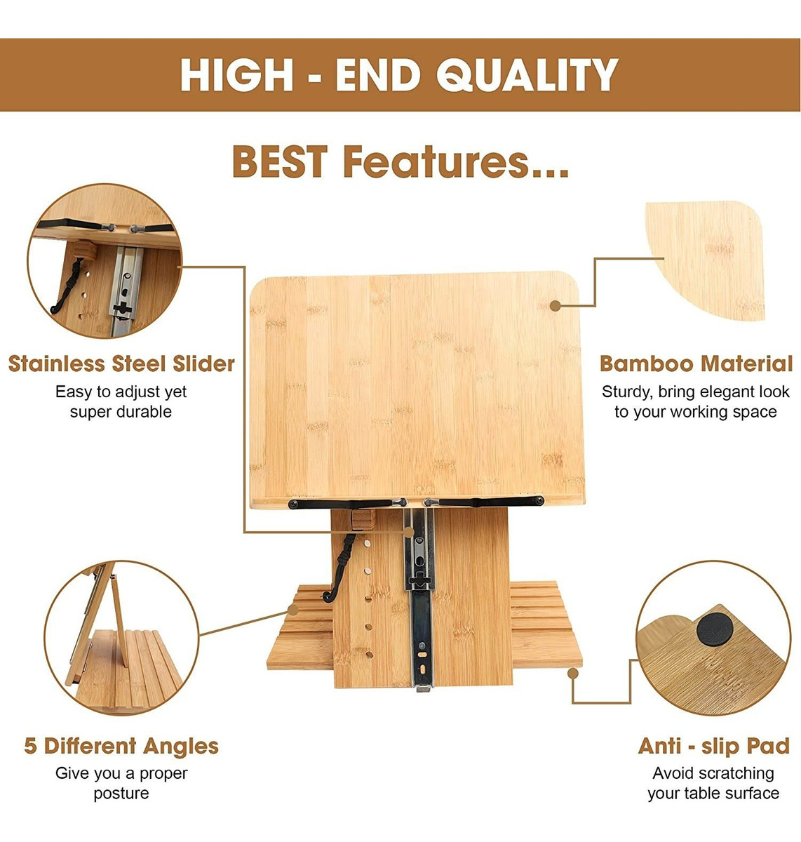 Altura y ángulo ajustables: este soporte para lectura se puede ajustar fácilmente con hasta 7.9 in de altura y 5 ángulos diferentes, establece el nivel de ojos perfecto para cada persona. Con un diseño práctico, puedes leer todos tus libros favoritos o utilizar ordenadores portátiles, tabletas todo el día porque te proporciona una postura adecuada.; Material de alta gama: este soporte para libros de texto está hecho de material de bambú, no solo es muy resistente, sino que también aporta un aspecto elegante a tu espacio de trabajo. Viene con un deslizador, súper duradero y fácil de ajustar. Este soporte de lectura también tiene un olor cómodo para ayudarte a relajarte mientras disfrutas de tus libros.; Diseño multifuncional: este soporte de lectura tiene un fuerte soporte de página para mantener tus libros siempre abiertos mientras que permite cambiar fácilmente las páginas. Su resistente bandeja frontal es de 14.0 x 10.0 in y puede soportar diferentes tamaños y estilos de libros, ayuda a este soporte ajustable para libros a convertirse en un soporte para tableta, recetas, o soporte para libros de cocina. Revistas, papel de pintura, catálogos, escritorio, partituras, documentos también funcionan en este soporte de libros.; Portátil y ligero: puedes plegar este soporte elevado para libros fácilmente y ponerlo en una mochila, lo que te permite llevarlo a todas partes. Su peso ligero y portátil hará que sea fácil de llevar en tus viajes o viaje de trabajo. Está diseñado para ser perfecto para usar sobre la marcha; Idea maravillosa para regalo: gracias al diseño multifuncional, se puede utilizar en casi todas partes como cocina, escritorio de trabajo, biblioteca, interior o exterior. Será una idea de regalo perfecta para cualquier persona que ama leer, cocinar, trabajar y puede ser un regalo para cualquier ocasión como cumpleaños, Navidad, boda, inauguración de la casa, etc Todos nuestros productos estan en inglés SKU 91221060619