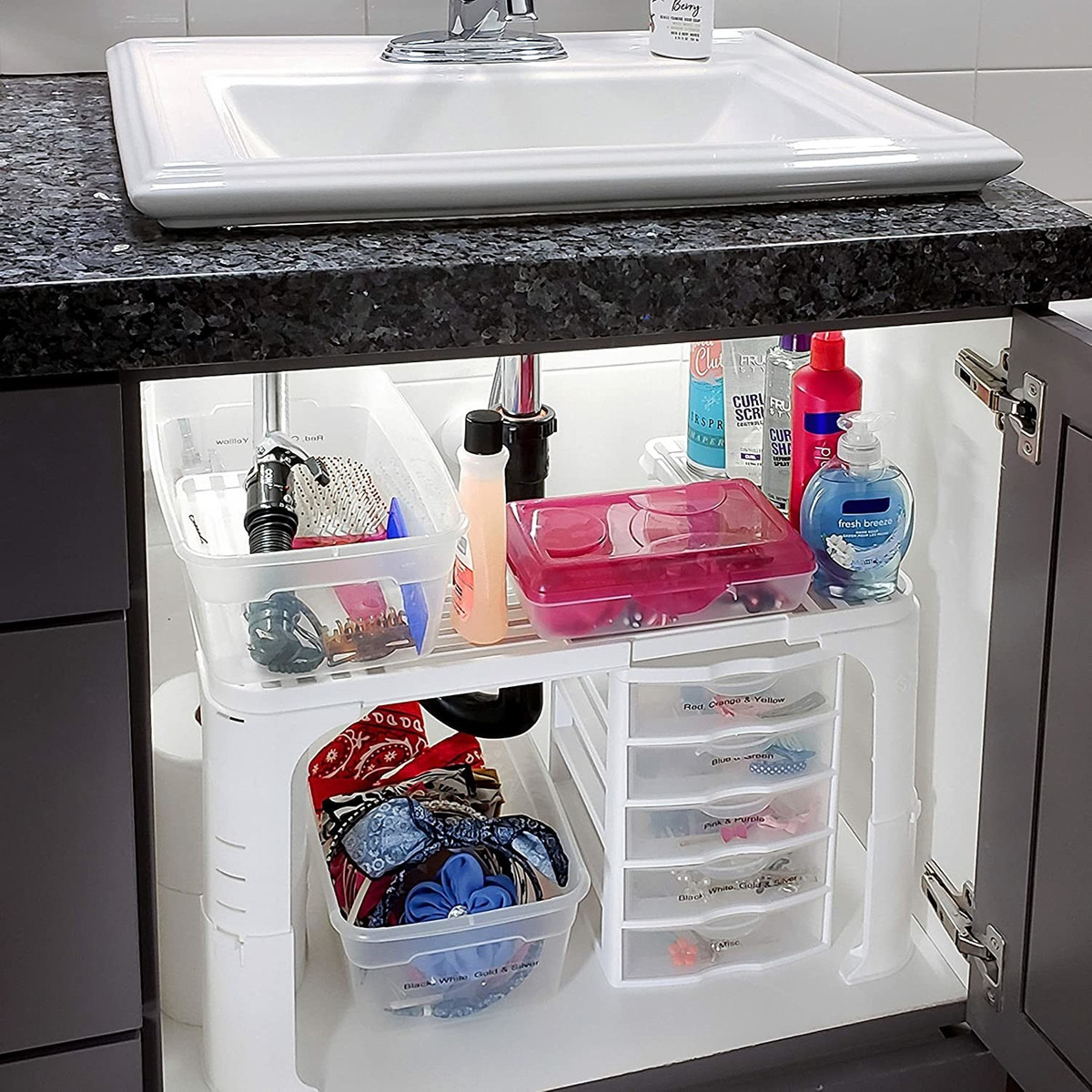 Fácil de montar: nuestro estante organizador para debajo del fregadero viene en 1 caja, 4 patas y 1 parte superior y es fácil de montar en cuestión de minutos, así como mover de habitación a habitación para tus necesidades. Cuando completes tu organizador de fregadero de cocina, puedes ajustarlo a 1 de 4 alturas ajustables.; Diseño ajustable: nuestro organizador de estante expandible se extiende en ancho, altura y profundidad desde 16 pulgadas de ancho x 10 pulgadas de alto x 10 pulgadas de profundidad hasta 20 pulgadas de ancho x 13 pulgadas de alto x 14 pulgadas de profundidad, lo que te da la máxima flexibilidad para tus necesidades. A diferencia de otros organizadores de fregadero, nuestro diseño te permite girar tu organizador de almacenamiento de cocina debajo del fregadero 360 grados para adaptarse mejor a tu fontanería.; Material de alta calidad: nuestro organizador de fregadero para debajo del baño está hecho de plástico ligero, resistente y duradero. Este organizador de baño debajo del fregadero está probado para soportar hasta 40 libras para acomodar todos tus suministros de limpieza.; Ideal para cualquier habitación: nuestro estante organizador de cocina debajo del fregadero es muy fácil de reubicar cuando sea necesario, ya que funciona muy bien para cualquier habitación. Organización y almacenamiento de cocina, organizador debajo del armario, almacenamiento debajo del fregadero para baño, etc. Este organizador de almacenamiento debajo del fregadero funciona muy bien para cualquier habitación.; Spicy Shelf Garantía: en Spicy Shelf estamos a la altura de nuestros productos y ofrecemos una garantía de 1 año si algo le sucede a tu organizador debajo del fregadero, lo reemplazaremos sin cargo para ti. Simplemente ponte en contacto con Spicy Shelf directamente a través del sistema de mensajería de Amazon y estaremos encantados de ayudarte con cualquier problema o dificultad que encuentres. En Spicy Shelf, la satisfacción del cliente es el 100 % que buscamos. Con sede en Estados Unidos Organizador de cocina y baño para debajo del fregadero y almacenamiento hecho de plástico ligero y resistente. Soporta hasta 40 libras de suministros de limpieza y el diseño permite una rotación de 360 grados al decidir el mejor ajuste para tu fontanería. Se extiende en ancho, altura y profundidad de 16 pulgadas de ancho x 10 pulgadas de alto x 10 pulgadas de profundidad a 20 pulgadas de ancho x 13 pulgadas de alto x 14 pulgadas de profundidad. Todos nuestros productos estan en inglés SKU 91221044135