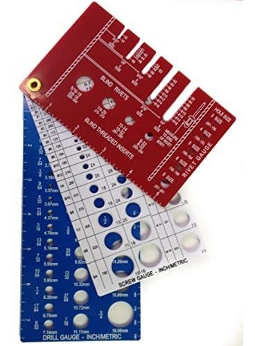 Incluye un total de 3 medidores diffrent !; 1) Broca Gauge (fraccional y métrico) Color: Azul; 2) internamente roscado Gauge Color: Blanco; Reverso un medidor Drill válvula; 3) Remache Gauge Color: Rojo Esta es una herramienta indispensable para cualquier persona que utiliza tornillos, brocas, machos o remaches. Medidas fraccionales o métricas Todos nuestros productos estan en inglés SKU 12062116779