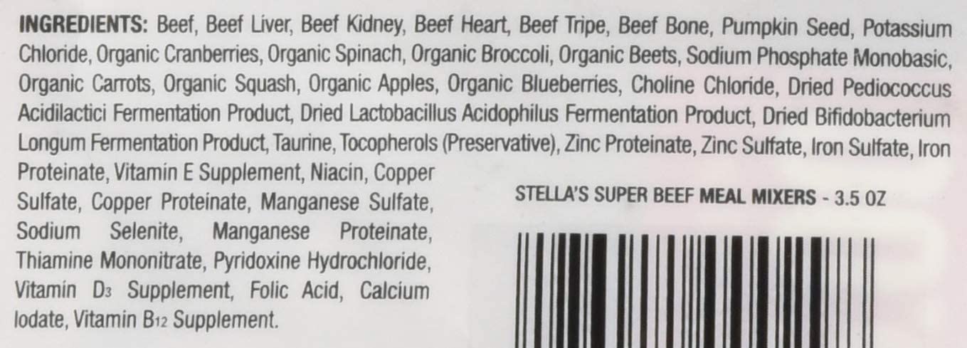¡Perfecto para los comedores quisquillosos! Agregue una cucharada de Meal Mixers para comida para perros a la comida seca o croquetas para obtener un impulso crudo de nutrición y sabor. A su perro le encantarán los Super Beef Meal Mixers de Stella’s 95 % de carne de res, órganos y huesos alimentados con pasto, además de frutas y verduras orgánicas