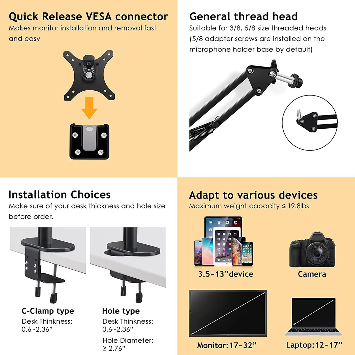 Compatible con dispositivos multimedia: el soporte 6 en 1 puede acomodar portátiles de 12 a 17 pulgadas, monitor de 17 a 32 pulgadas y teléfono móvil de 3.5 a 6.7 pulgadas, cámara SLR y DSLR/tableta de 7 a 13 pulgadas.; Anillo de luz y brazo de micrófono: fuente de alimentación USB-A a USB-C a la luz de anillo LED, con una interfaz roscada universal de 1/4. Brillo y tono de color son ajustables, tres etapas de tonos de color (3500 K-5500 K): frío/natural/cálido. El brazo del micrófono tiene una interfaz roscada universal de 3/8.; Transmisión en vivo profesional: soporte de escritorio para grabación y transmisión en vivo, personaliza tu propia configuración. Ajusta tu dispositivo a la altura y ángulo preferidos, intercambiar tu dispositivo, hace que la transmisión en directo sea mucho más fácil. Organiza tu espacio de escritorio a la configuración preferible como clase en línea, reuniones, grabación, transmisión, música/entretenimiento/transmisión de juegos.; Dos métodos de instalación: el diseño de abrazadera C es adecuado para escritorio con un grosor de 1,5 a 2.4 in. El diseño de tipo agujero necesita un agujero de 2.8 in de diámetro en el escritorio. Nota: el producto no es compatible con escritorio de cristal.; Guía de montaje y soporte: tenemos vídeo de montaje en la página del producto, y el paquete también contiene un detallado manual de instalación, sigue los pasos para completar la instalación. Garantizamos un reemplazo gratuito de 30 días, 1 año de garantía y soporte al cliente (respuesta dentro de 24 horas). Puedes contactar con nosotros al asistente de mensajería del vendedor o contactar con el vendedor. Todos nuestros productos estan en inglés SKU 91221079945