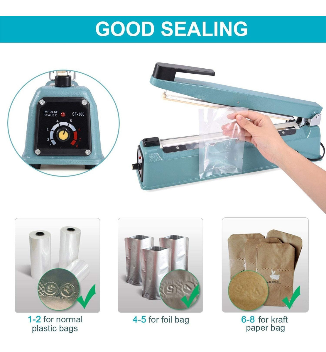 Sellado en 3 Segundos con sellador de impulso de 12 Pulgadas, sin NECESITA Tiempo de Calentamiento. El Proceso de sellado es muy sencillo. Simplemente Conecta la Alimentación y ajusta el Temporizador. LUEGO, Coloca la bolsa en el Elemento de sellado y presiona el mango para Iniciar el Dispositivo. El circuito electrónico controlará automaticamente El Tiempo de Calentamiento, y la Energía se apagará automaticamente Despues De Que El indicador LED se apague. Despues de la UNOS 1-2 Segundos, suelta el mango para Completar la ONU sellado perfecto .; La Longitud de sellado de calor de 11.811 en, el ancho de sellado es de 0,118 pulgadas, grosor Máximo del sellado: 10 milésimas de pulgada. Diseñado con textura de metal, revestimiento de doble capa, buena Estabilidad y buen efecto antioxidante. Fusible Integrado y Elemento de Calefacción Se Puede CALENTAR rapidamente y de forma segura Como utilizar. 2 juegos ADICIONALES de Elementos de sellado y hojas de teflón, 50 Bolsas de Envoltura de 3,9 x 5,9 pulg. La bolsa retráctil es apretada, suave y ordenada, PUEDE selar Cosas dulces, Arrastre, Medicamentos y Más artículos pequeños .; La máquina de sellado de Pulso De Calor Tiene 8 AJUSTES de Temporizador ajustables, y El Tiempo de Calentamiento se ajusta de Acuerdo con el grosor del material de sellado de, Que PUEDE proporcionar ONU sellado perfecto para Bolsas de Diferentes Materiales y grosores. Fácil de USAR, no utilices ONU paño húmedo para Limpiar la superficie del sello térmico .; Amplio Uso: Máquina de sellado Manual de Pulso de Bajo consumo, no tóxica, sin olor, duradera, Reforzada y comprimida, y PUEDE selar Más De 10.000 Bolsas. Este producto Es Un sello perfecto para Kel-F, Mylar, Polyflex, P.V.A., Pliofilm, Tivac, Saran y BOLSAS Todas Las Otras termosellables. Es Muy ADECUADO Para El Hogar, venta al por menor, Productos Agricolas, tiendas de comestibles y sellado industrial .; Vida Útil ultralarga: el sellador de Bolsas de Pulso utilizació bobinas de cobre puro en el interior. En comparacion con Otros Transformadores de aluminio, El Transformador de cobre puro reducir La Perdida de Calor y la carga de Trabajo, y el sellador de calor de Pulso Tiene Una Vida Útil Más Larga. Tamaño: 12 Pulgadas