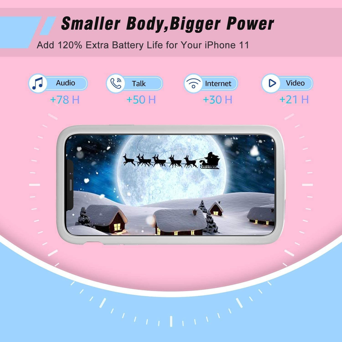 Nota importanteSolo compatible con iPhone 11 (6.1 pulgadas), no compatible con 11 Pro o iPhone 11 Pro Max. No es compatible con reproducción de coche/carga rápida/carga inalámbrica Qi.; Añade un 120% de duración extra de la bateríaEsta funda de batería para iPhone 11 de 5000 mAh proporciona un 120% de energía adicional para tu iPhone 11, lo que significa que puede añadir reproducción de video de 21 horas, añadir un reproductor de audio de 78 horas. Te permite disfrutar de más horas de entretenimiento y trabajo.; Fácil de usarEl diseño de una sola pieza hace que la instalación y el transporte sean más fáciles y seguros. Simplemente desliza tu iPhone 11 en la funda de carga, pulsa el botón de encendido posterior durante 3 segundos para empezar a cargar. Los 4 indicadores de luces LED traseros pueden mostrar el consumo de la funda del cargador. (0–25%–50%–75%–100%).; Escucha y sincronizaciónCompatible con auriculares Bluetooth y auriculares de cable, puedes disfrutar de audio y música en cualquier momento sin quitar esta funda de carga para iPhone 11. Sincroniza cómodamente tu iPhone a tu computadora, PC o laptop sin tener que quitar la funda de la batería.; Protectiva, suave, portátilHecha de goma de silicona, esta funda de carga para iPhone 11 puede ofrecerte un tacto cómodo. Y no se desliza fácilmente cuando la sostienes o la pones en tu bolsillo. No es un cargador, sino también una funda protectora, que protege tu iPhone del desgaste. Todos nuestros productos estan en inglés SKU 91221081381