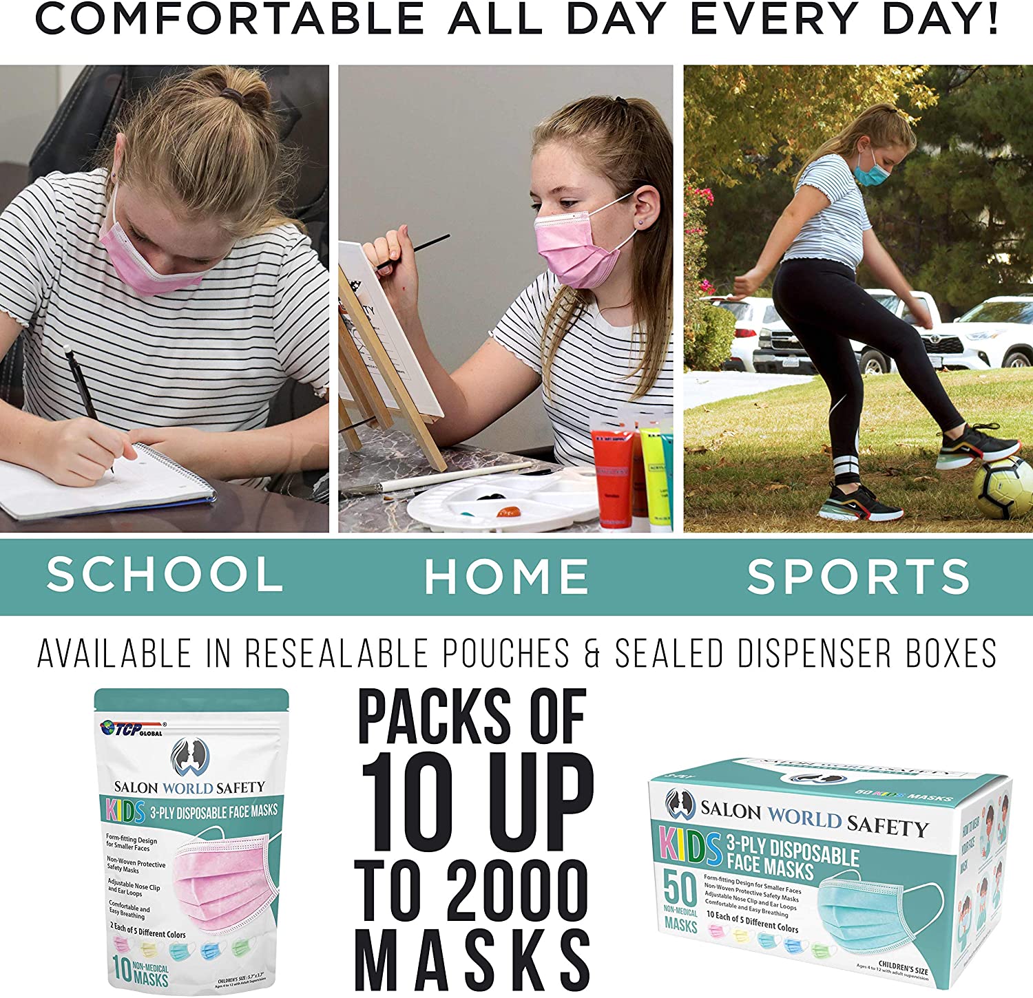 Especificaciones: TCP Global Salon World Safety – Máscaras faciales para niños 10 Pk 3-Ply Protective PPE (5 colores, 2 cada uno)