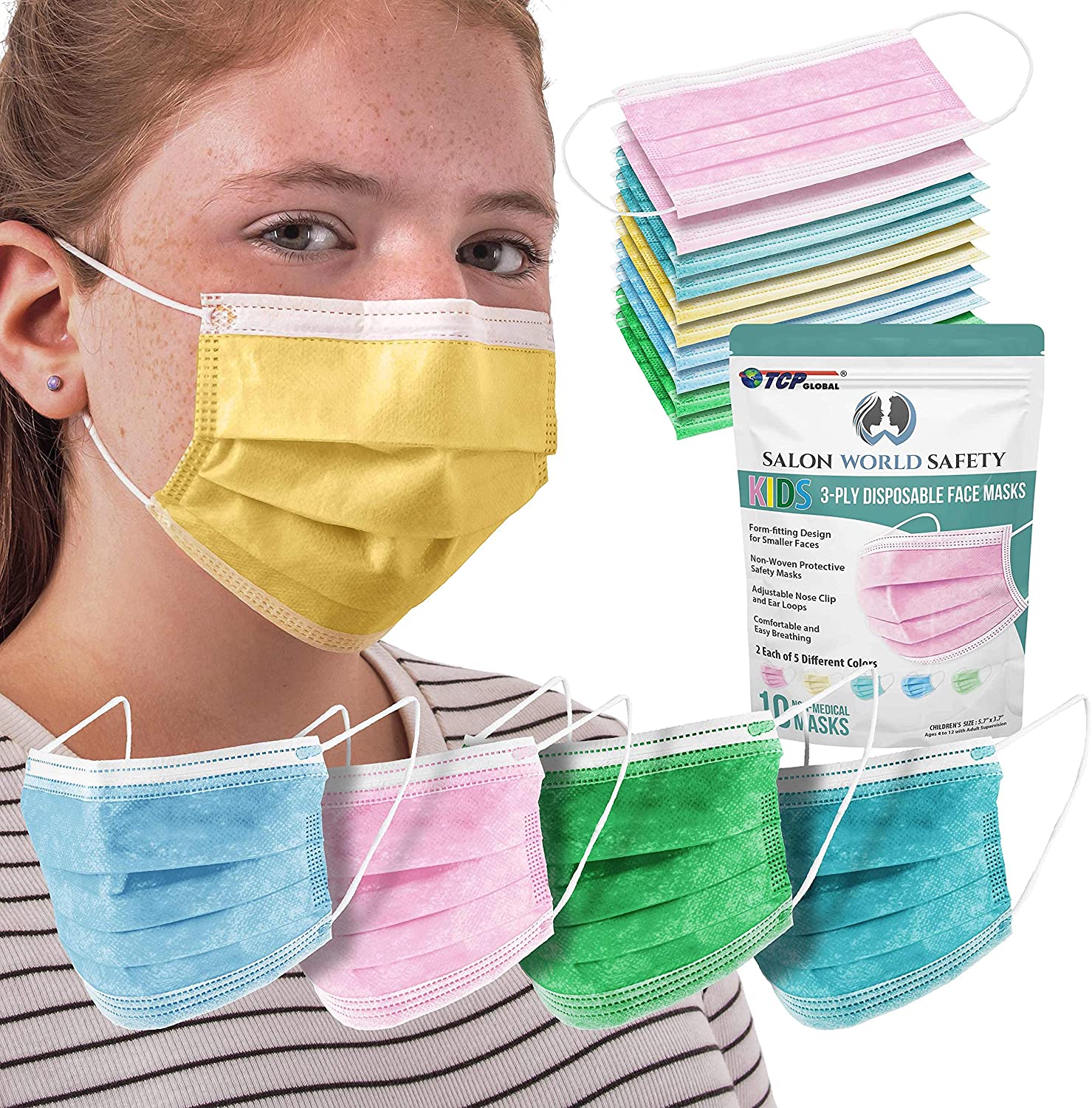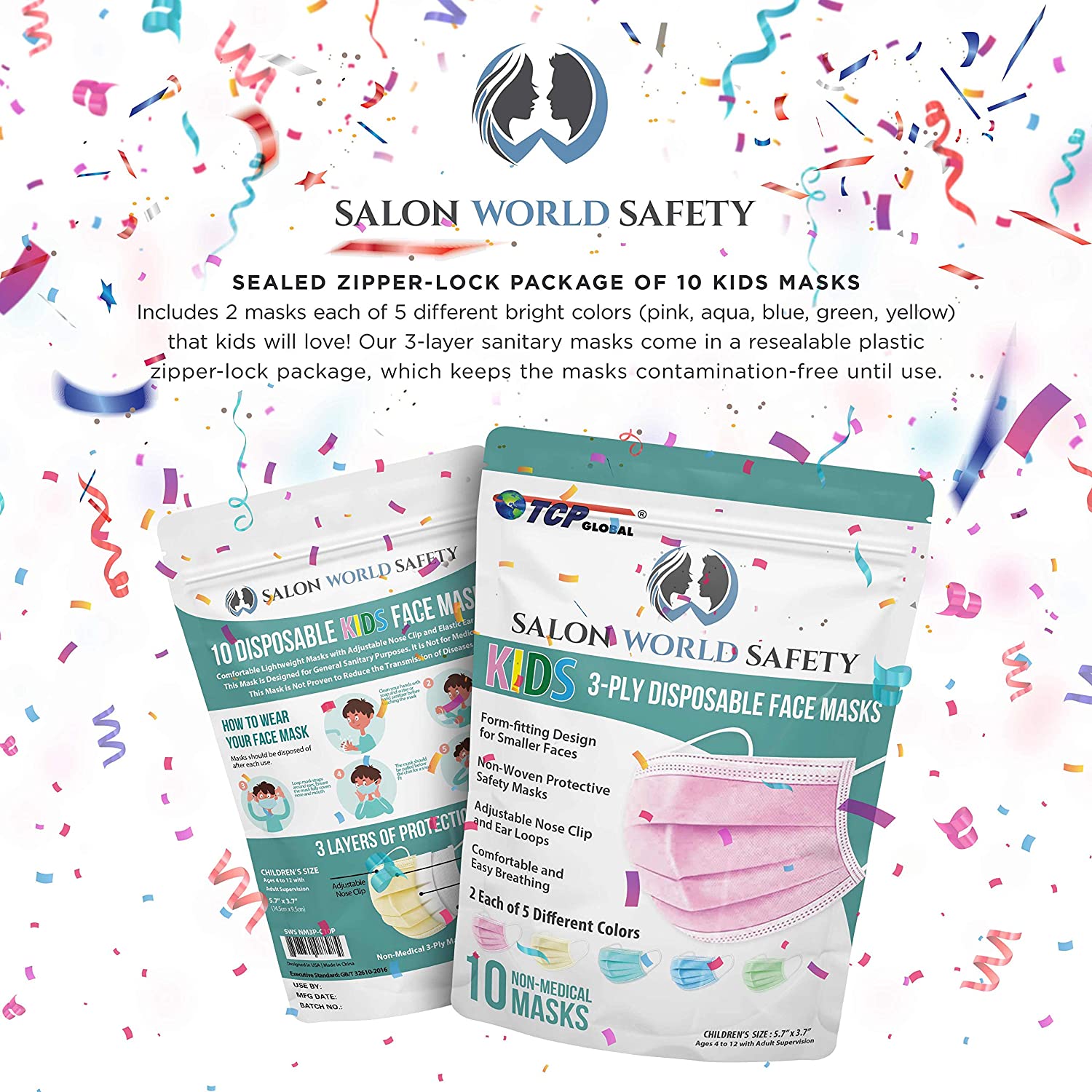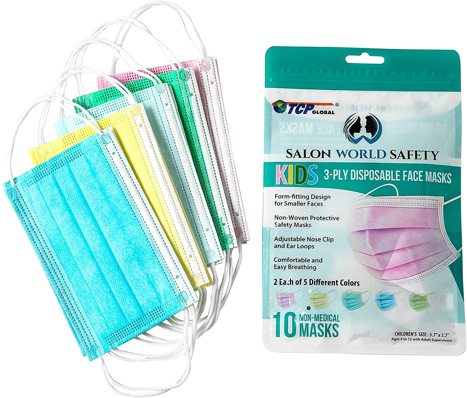 TCP Global Salon World Safety – Máscaras faciales para niños 10 Pk 3-Ply Protective PPE (5 colores, 2 cada uno)