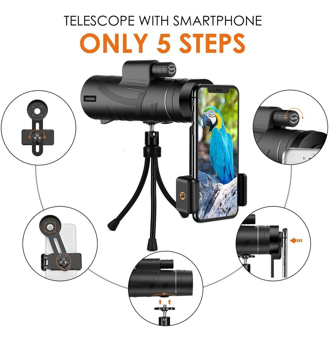 Grabar la belleza de la naturaleza VIVREAL monocular tiene soporte de teléfono inteligente rápida que adecuado para casi todos los teléfonos celulares. El monocular es perfecto para una variedad de visitas turísticas, actividades, incluyendo la observación de aves y la caza. Cuando se va de paseos por la naturaleza, se puede usar el monocular con su teléfono celular para tomar muchas fotos bonitas. Todos nuestros productos estan en inglés SKU 4022163060