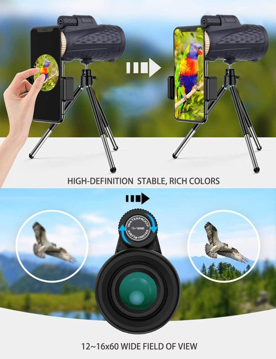 Telescopio Perfecto para principiantes: Este Es Un telescopio monocular de zoom Fácil de Usar Y potente. Diseñado para proporcionar una Los Nuevos Usuarios del Telescopio Una Combinación Perfecta de Calidad, valor, Función y Función. Muy ADECUADO para Viajes de fin de semana o Viajes nocturnos .; Resistente al agua y Fácil de enfocar: Aumento total de de 16 Veces y Diámetro de lente de 2.165 en, lo que te permite ver más Lejos y Más Amplio. Proporciona Imágenes claras y brillantes y disfruta del hermoso paisaje a distancia. El telescopio monocular de alta potencia Tiene Un Amplio campo de visión de 255,9 pies / 3,280.8 pies. ESTA chapado con revestimiento de banda ancha FMC y Prisma BAK4 de Alta Calidad para Garantizar Imágenes Vividas. El Cuerpo es pequeño y resistente y PUEDE soportar el Mal Tiempo .; Amplia aplicabilidad: Este telescopio monocular de alta potencia de 16 x 55 ES ADECUADO Para Adultos y Niños. Es Un buen socio para escalada, senderismo, Conducción, Carreras, viajes, Observación de la vida silvestre, Observación de aves, turismo, caza, etc .; Telescopio con zoom para teléfonos inteligentes: Soporte para Teléfono inteligente con alineación Rápida, trípode y el control remoto. Compatible con iPhone 8/8 Plus, 7/7 Plus, 6 / 6s Plus, Samsung Galaxy S9 / S9 Edge, S8 / S8 Edge, S7 / S7 Edge, LG, HTC y Sony casi todos los teléfonos inteligentes Demás del Mercado. Fácil de Instalar, el control remoto de Un Solo Ojo, proporciona imagenes de Alta Definición para compartir con tus amigos .; Nota: PUEDE Que necesites quitar ALGUNAS fundas Grandes para Instalar El Teléfono En El adaptador. Despues de Instalar El Teléfono En El ocular, PUEDES Capturar Imágenes Fijas o de vídeo, y También Puedes Como utilizar TODAS LAS Demás Funciones del Teléfono. Cuando El Teléfono todavía this Instalado en el adaptador, PUEDES INCLUSO enviar fotos a amigos o publicarlas en las redes sociales Simple y Fácil de USAR. Coloque el Telefono en el adaptador, apunte la Cámara del Telefono en el ocular y el uso LUEGO El Botón para FIJAR EL adaptador en Su Lugar.