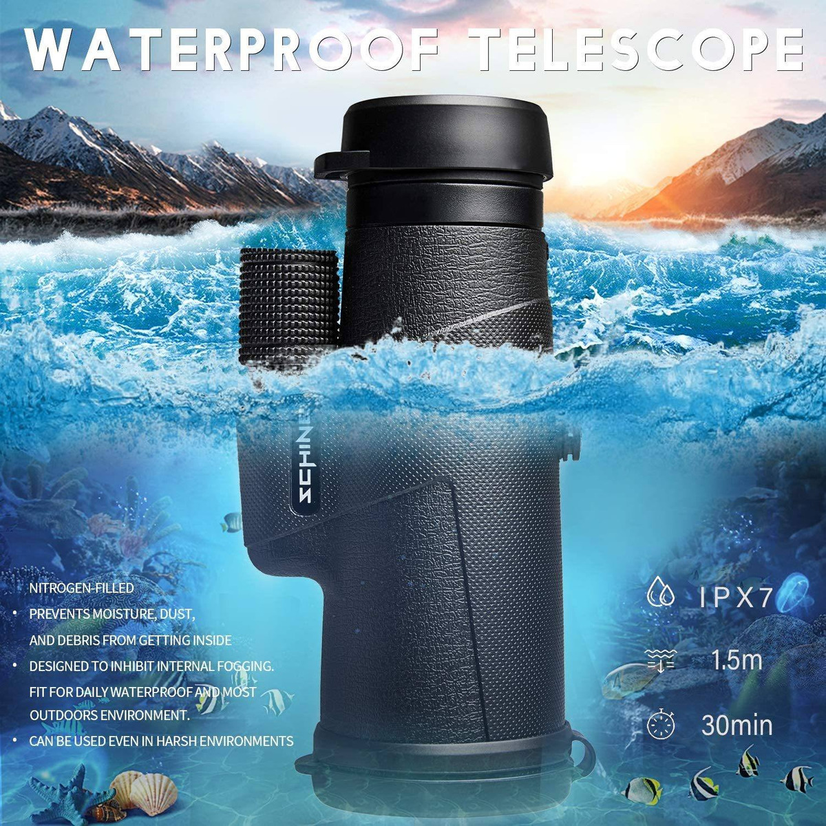 Resistente al agua, a prueba de niebla, a prueba de polvo y a prueba de golpes. Completamente sellado y Lleno de Nitrógeno 100% del mar Hace Que a prueba de niebla y Lluvia párrafo Evitar Que La Humedad, El Polvo y Los residuos Entren en el monocular.