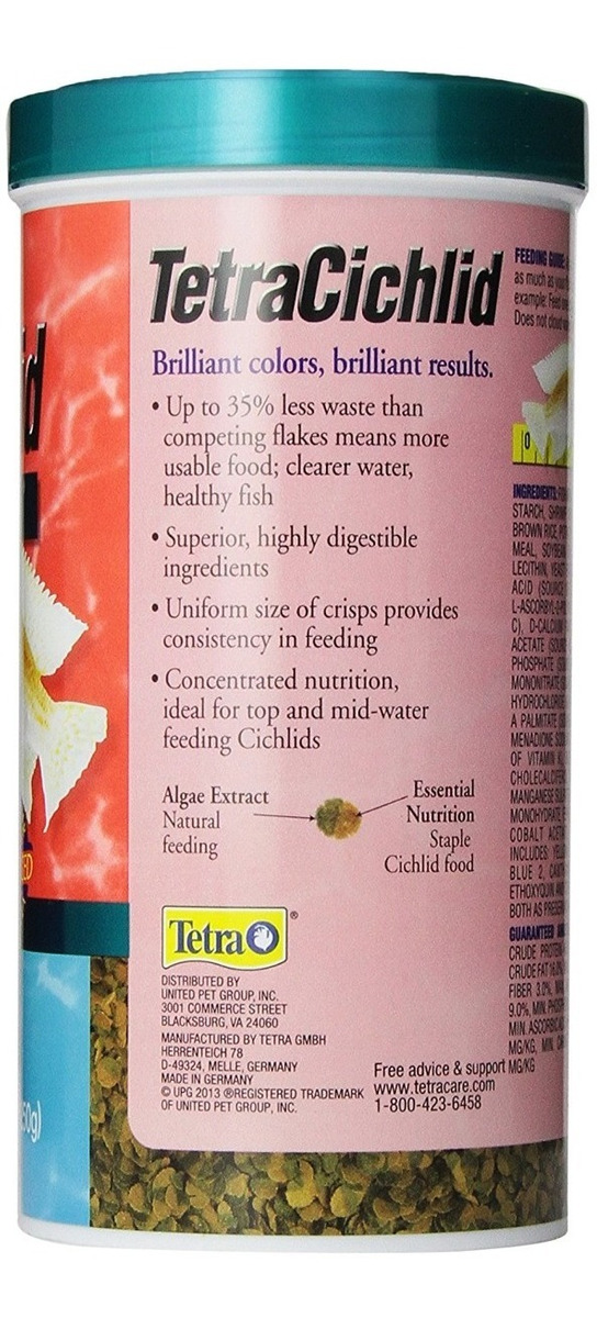 Suplementos / Se usa para tratar: Grandes conjuntamente con dietas primarios de Tetra, estos alimentos proporcionan variedad saludable para los peces. Lo último en cíclidos Nutrición; Más firme que escamas, cada quebradizo Cichlid es medio verde (extracto de algas concentrado) y medio de color beige (Cichlid grapa); A pesar del alto contenido de proteína y grasa la formulación agua clara no nube de agua Adicional Filtrado Todos nuestros productos estan en inglés SKU 22091723527