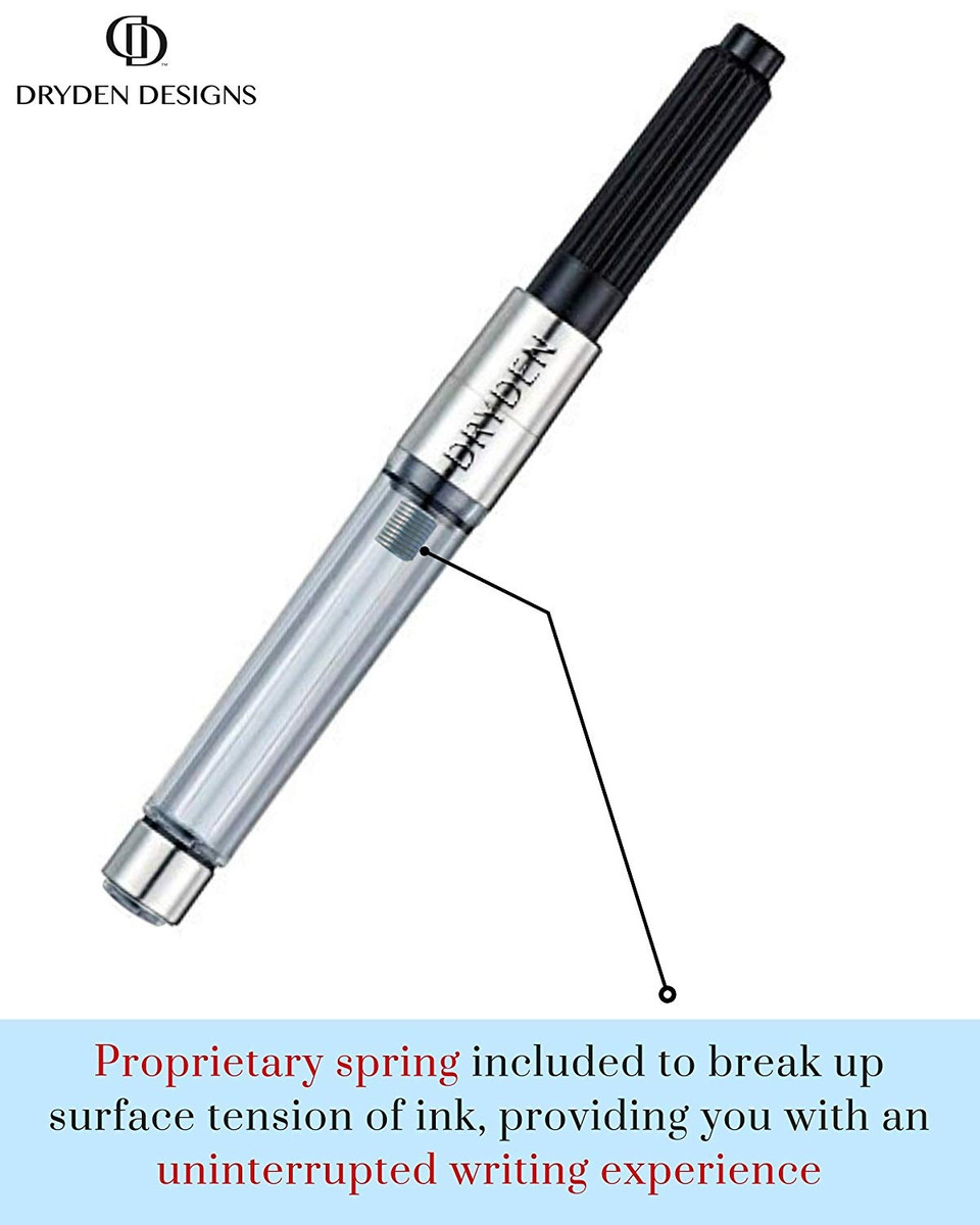 CONVERTIDOR TWIST para facilitar la carga y dispensación de tinta! Un resorte se incluye en el interior del convertidor para romper la tensión superficial de la tinta, que le proporciona un flujo ininterrumpido de tinta; TAMAÑO universal compatible con casi todas las plumas estilográficas en el mercado. Si su pluma acepta Norma Internacional de cartuchos de tinta de tamaño, se puede aceptar la tinta Dryden convertidor !; DISEÑO amplias como para sostener una cantidad generosa de tinta !; PUSH IN estilo para una experiencia libre de problemas .; Marco robusto para años de escritura hermosa! Convertidor Todos nuestros productos estan en inglés SKU 27061934857