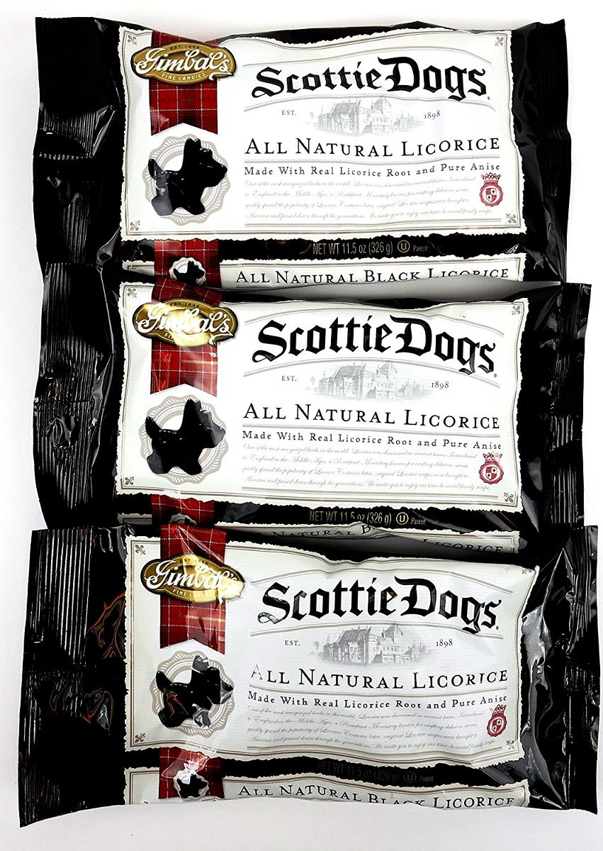 Incluye tres bolsas de 11.5 oz de All Natural Negro regaliz Perros del escocés del cardán; Sin Gluten, maní gratuito, árbol sin frutos secos, leche, sin huevo libre, libre de grasas trans, gelatina gratuito, libre de soja, pero no los sabores o colores artificiales, conservantes; Unión ortodoxa Kosher Pareve; Hecho en los EE.UU.; En Certificados Embalaje libre de frustraciones Empaquetado del producto: Frustración-Libre Embalaje
