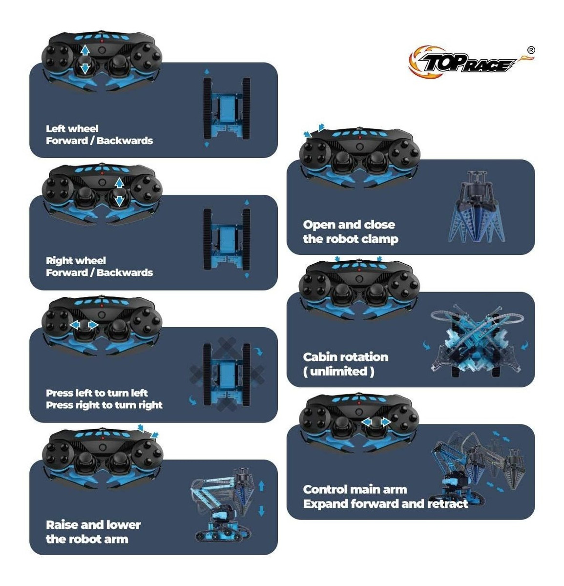 Top Race control remoto Brazo robótico, Full Metal robótico excavador Kit de Ingeniería; Hecha de acero pesado, engranajes de plástico pesados y neumáticos de caucho; 18 canales de control completa con los 5 motores, no sólo un juguete, sino una máquina de ingeniería machenical grado manía; 151 partes para poner este robot de brazo juntos, todo incluido listo para su uso; grande 1300mAh Lipo recargable de la batería, el cargador del USB, 2 pelotas para jugar con y un folleto de instrucciones muy claras, Tiempo de carga: Alrededor de 90 minutos, Control de Distancia: Alrededor de 70 pies, disfrutar de la scienc de robots, Top Race control remoto Brazo robótico, 18 Canales Full Metal robótico excavador Ingeniería kit, el brazo TR-R1 Robot Top Race está hecho de acero pesado y engranajes de plástico y cubierta de caucho pesado, esto no es sólo un juguete, sino más bien un hobby de grado de ingeniería machenical gran máquina para niños mayores y adultos, el conjunto contiene 151 partes de poner este brazo del robot juntos, una vez que el robot está montado que puede hacer muchas cosas y Challanges con su mando a distancia, con la goma pesada horquillas captar la imaginación es infinita, este Top robot de carrera son un conjunto todo completo incluido listo para usar, lo único que se necesita son 2 x pilas AAA para el control remoto, el brazo del robot incluye una gran 1300mAh Lipo recargable de la batería, el cargador del USB, 2 pelotas para jugar con y una muy instrucciones claras folleto, Tiempo de carga: Alrededor de 90 minutos, control de Distancia: Alrededor de 70 pies, disfrutar de la scienc de robots, Todos nuestros productos estan en inglés SKU 403211960