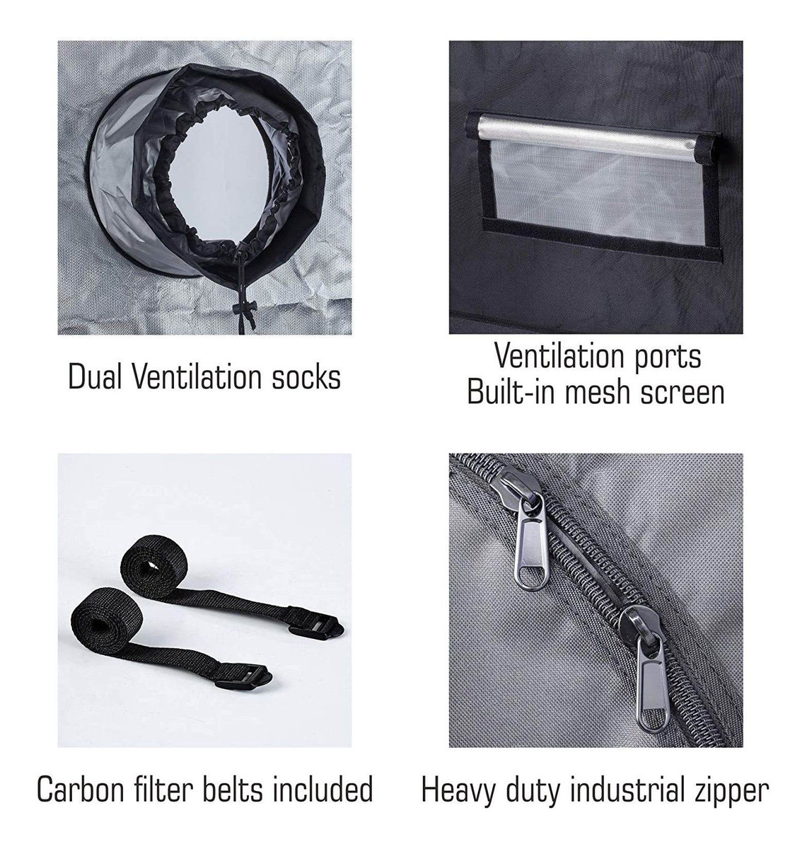 cubierta Tent: Interior: diamante a prueba de luz 96% altamente reflectante Mylar (mejorar el efecto reflectante) ,; Frame: diameter16MM blanco recubierto de pintura varillas de metal; Durable: Heavy Duty 600D a prueba de luz de tela Oxford y 16 mm de diámetro revestido blanco de pintura varillas de metal y grandes de servicio pesado cremalleras y doble costura para la protección contra fugas de luz; Vents: respiraderos redondas con malla para una mejor ventilación y múltiples orificios de ventilación para el ventilador y la salida de filtro; El paquete incluye: 1x 96% 600D reflectante Cultivo toldo de cubierta 1 conjunto de marco 16MM de varillas y conectores / Cinturones 1x extraíble a prueba de agua de la bandeja del piso / nylon se pueden utilizar para el filtro de instrucciones Asamblea correas / 1x Todos nuestros productos estan en inglés SKU 4032120474