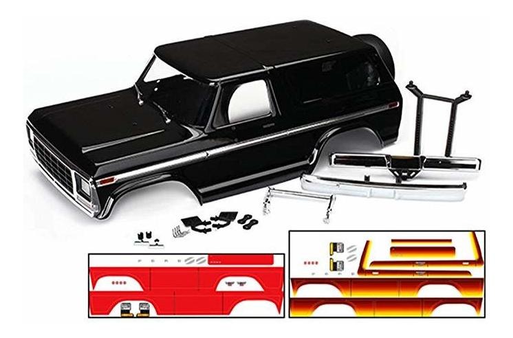 El kit incluye un cuerpo Bronco totalmente pintado y recortado para el TRX-4 con 312 mm de distancia entre ejes; Incluye los accesorios cuerpo, réplica de la llanta de repuesto, espejos de las puertas, tiradores de las puertas cromadas, y limpiadores para el detalle increíble escala; Cuerpo viene pintada de negro. Aplicar calcomanías, ya sea rojo o atardecer para una apariencia personalizada; También incluye defensas cromadas con barra de empuje, y un poste de cuerpo trasera Convertir el TRX-4 (312 mm de distancia entre ejes) a la impresionante cuerpo 1979 Ford Bronco con este kit todo incluido. El kit incluye un cuerpo de Bronco totalmente pintado y recortado completa con el ajuste del cuerpo, réplica de la llanta de repuesto, retrovisores exteriores, manijas de las puertas cromadas, y limpiadores para el detalle increíble escala. El kit también incluye rojos y Sunset precortadas calcomanías, defensas cromadas con barra de empuje, y un poste de cuerpo trasera. Traxxas utilizar valores y hop-up piezas de repuesto para obtener el máximo rendimiento de sus vehículos Traxxas. Este producto está hecho de materiales de alta calidad y diseñado para un rendimiento de larga duración. Esta es la sustitución de hardware para su uso en vehículos de Traxxas; consulte el manual del usuario para los listados de piezas exactas. Todos nuestros productos estan en inglés SKU 10101910363