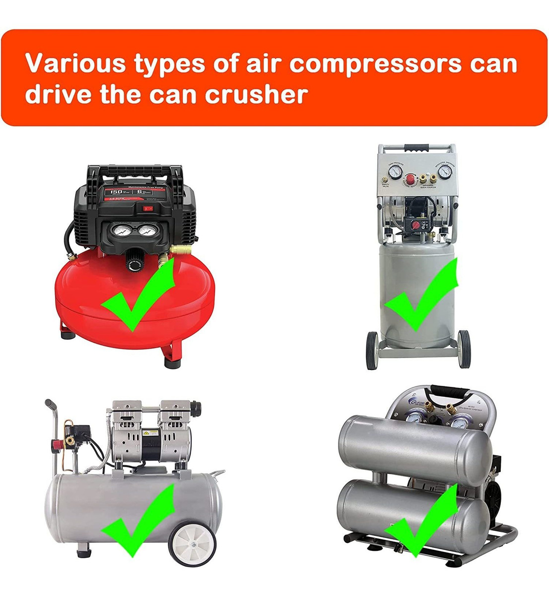 Tritura latas como un profesional Se puede utilizar con una sola mano. El cuerpo de acero sólido aplasta latas a sólo 1 pulgada de grosor muy fácilmente y descarga automática después de aplastar.; Juego de niños Una de las grandes cosas de este modelo es que es lo suficientemente seguro y fácil para que los niños lo usen. Esta es una gran manera de enseñarles acerca de la importancia del reciclaje, e incluso puedes convertirlo en un juego.; Fácil hacerlo Este modelo ha sido diseñado para ser especialmente rápido y fácil de montar en la pared. Se suministra con un kit de instalación completo (premontado), así como un conjunto claro de instrucciones a seguir.; Un verdadero ahorro de espacio Basado en nuestras pruebas, el triturador de latas puede reducir la cantidad de espacio de latas de aluminio ocupar un 75%. Esto significa que puedes almacenar más latas en la misma cantidad de espacio.; Advertencia Presión de trabajo: 100 psi. Se necesita un compresor de aire para conducir la trituradora de latas. Tamaño:5.7 x 4.6 x 22.5 inches