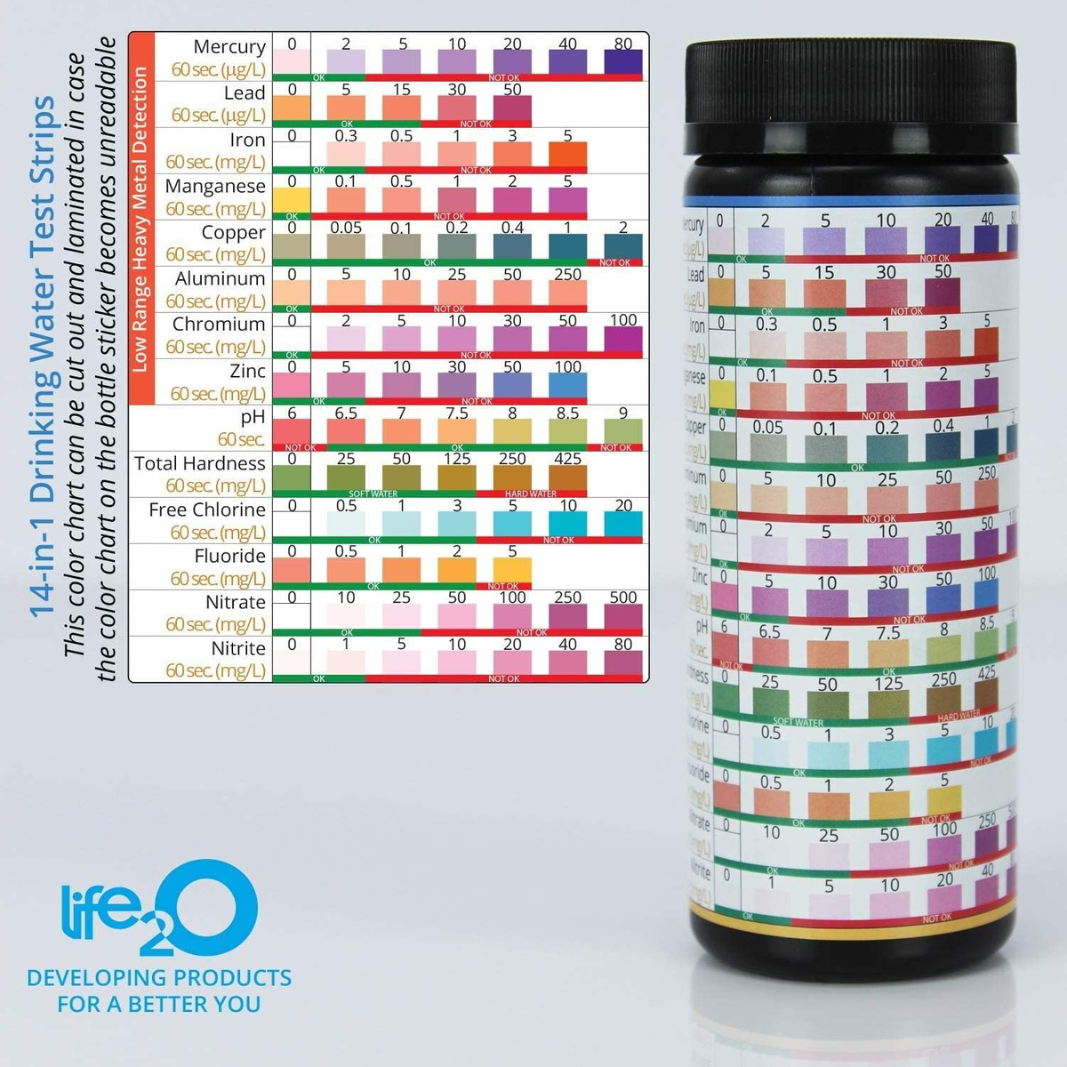 PROFESIONAL DE GRADO – life2O agua potable dip-palos, con los cojines en color de alta precisión de 99%, son una manera rápida, fiable y rentable manera de prueba de lo que está bebiendo si es del grifo, botella, filtro, la jarra o suavizante .; TRACE los metales pesados – El mayor riesgo para la salud de los hogares en el agua potable es metales pesados. life2O es la única tira de prueba en el mercado que puede medir incluso la mayoría de cantidades traza de metales pesados .; 14 PARÁMETROS – El kit completo del agua potable más disponibles: mercurio, plomo, hierro, manganeso, cobre, aluminio, cromo, zinc, pH, dureza total, cloro libre, nitrato y nitrito .; Cocina y baño GRIFOS – Pruebas de agua potable de la ducha o grifos de agua dura y otras impurezas pueden ayudar a mejorar la eficiencia del agua y la limpieza de la ducha, el baño o la ingestión de agua .; Fácil de usar – Las instrucciones simples con salsa y leer los resultados visuales en 60 segundos, carta de colores sencillo. Tiras de prueba de agua life2O 14-en-1 Bebida están hechos de la misma tecnología que nuestras tiras médicas. Obtener un poco de tranquilidad al saber lo que está poniendo en su cuerpo con el agua que se bebe o si el hogar está bajo la amenaza de la mala calidad del agua.