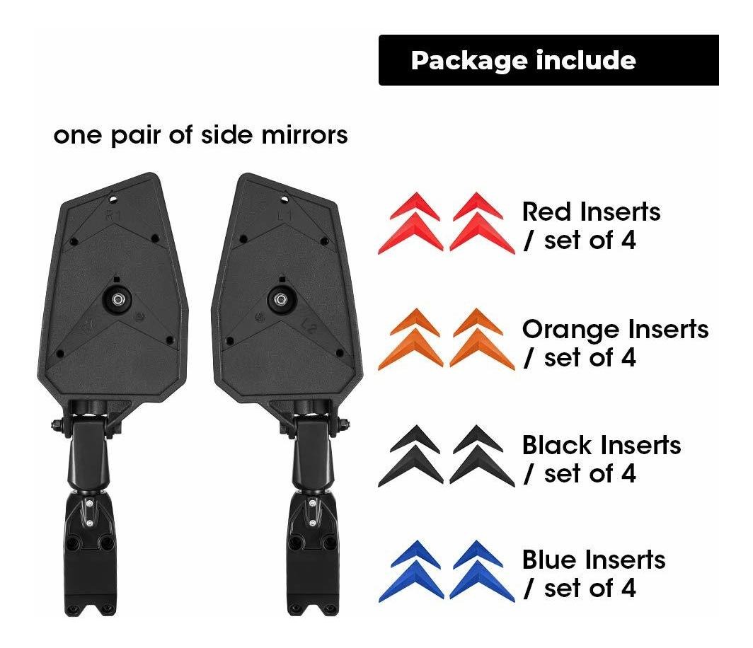 espejos laterales ¿¿ Paquete UTV vienen con Negro, rojo, azul, naranja inserciones, usted puede DIY y cambiar el color del espejo por sí mismo. Decoración de espejos laterales, diferentes de los demás y mostrar su propio estilo .; Ver ¿Montaje¿ UTV lado espejos sólo encaja UTVs con 1,75” bar roll. Tal como Polaris RZR 800 900 S 1000 XP y la lista continúa. Sólo asegúrese de que la barra antivuelco está 1.75” . Nota: no se ajustan a 2020 Polaris RZR 1000 .; ¿¿ Break-away Espejos laterales para el Polaris RZR tiene función de ruptura de 180 con ángulo ajustable Grado, es necesario comprobar o apretar los tornillos después de la instalación, y puede pulsar el cristal para ajustar el ángulo del espejo, también .; ¿¿ Materiales hace de cáscara de alto impacto ABS, lente de vidrio y las abrazaderas duraderos, todo el conjunto de espejos laterales RZR es desgaste y resistente a la corrosión, ideal para todas las condiciones meteorológicas; ¿Fácil Instalación¿ Instalar la abrazadera a la barra antivuelco en primer lugar, ajustar el ángulo del brazo de espejo, a continuación, conectar el brazo del espejo a la abrazadera. Todos nuestros productos estan en inglés SKU 6012015707