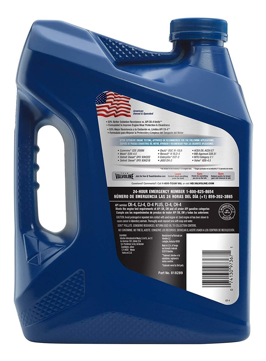 Para un mejor rendimiento, siga las recomendaciones del fabricante en el manual del propietario del vehículo .; Aprobado o recomendado para aplicaciones donde Cummins CES 20086, Mack EOS-4. 5, Volvo VDS-4. 5, Detroit Diesel DFS 93K222, Renault VI RLD-4, Allison TES-439, ACEA E9, ACEA E7, MB 228. 31, MTU Categoría 2. 1, Caterpillar ECF-3, o JASO DH-2 se especifican; Aprobado o recomendado para aplicaciones en las que se especifican Detroit Diesel DFS 93K218 o Deutz DQC III-10LA; Excelente resistencia a la oxidación y la retención de TBN apoya larga vida útil del aceite; estabilidad al cizallamiento fuerte proporciona un rendimiento estancia en el Grado Formulado para proporcionar un rendimiento y protección en los motores diesel modernos, equipados tratamiento de emisiones, incluyendo aquellos con escape de recirculación de gases de escape (EGR), filtros de partículas diésel (DPF) y otras tecnologías modernas motor diesel. Valvoline premium Azul 8600 ES tiene una extensión de 10.000 millas de drenaje única en motores Cummins X15 permite hasta 60.000 millas cuando la eficiencia de combustible promedio es de 6.5mpg superior. Valvoline ™ Premium Blue ™ es el único avalado y recomendado ™ exclusivamente por Cummins®. Todos nuestros productos estan en inglés SKU 70720059563
