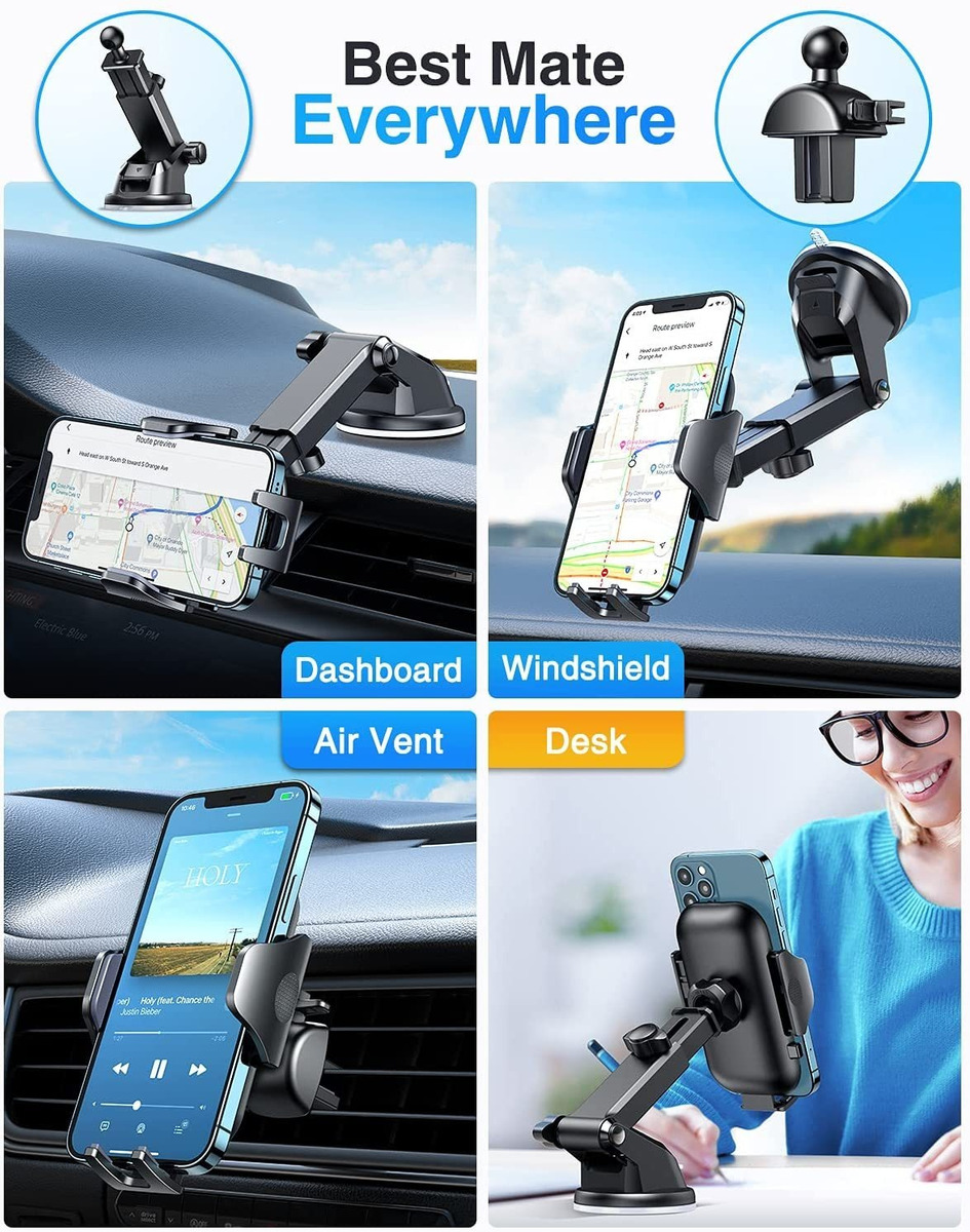 Diseño de abrazadera fácil Grandmaster, estructura patentada VANMASS diseña la abrazadera fácil líder en la industria que ha ganado 2 patentes en EUIPO para lograr una rápida sujeción y liberación. Pulsa el botón izquierdo para abrir los brazos y luego aprieta dos brazos para sujetar el teléfono. Muy fácil de usar durante la conducción. Mejor que otras almohadillas de silicona dura, nuestra cápsula de aire de silicona en el interior de las abrazaderas hacen que el teléfono aguante la colisión incluso sin la funda del teléfono; Soporte multifunción para teléfono, el mejor compañero en cualquier lugar: equipado con la ventosa y el clip de ventilación de aire, puedes montar el soporte de teléfono en la rejilla de ventilación de tu coche, salpicadero, parabrisas e incluso bañera, escritorio. Además, se aplica a la mayoría de los coches, camionetas, SUV, camiones, taxis; buen asistente para conductores Uber, Lyft. El cabezal giratorio de 360 grados te permite girar el teléfono para una vista vertical y horizontal. El brazo telescópico puede girar hacia arriba y hacia abajo 270 y extenderlo de 13,3 a 9.8 in; Múltiples ventajas originales, máxima protección para teléfono y coche El soporte para teléfono de coche VANMASS es el primer en la industria que adapta el material de aviación PTFE (no plástico barato), por lo que podría funcionar bien en entornos extremadamente duros. Además, ofrecemos una potencia de succión 3X que otras ventosas que pueden mantener el teléfono estable incluso en una carretera con baches. Además, el clip de ventilación original de nano-acero se adhiere firmemente a la rejilla de ventilación sin ningún tipo de vibración; Mejor experiencia de usuario, compañero de teléfono: VANMASS optimiza cada detalle del soporte para teléfono celular y es apreciado por muchos usuarios en todo el mundo. El primer diseño ergonómico de huellas dactilares en ambas abrazaderas te permite apretar los brazos para sostener tu teléfono firmemente; el primer pie ajustable podría ser compatible con todos los teléfonos móviles, como iPhone SE 13 12 11 Pro Max XR XS Max X 8Plus 7Plus, Samsung Galaxy S21 S20 S10 S9 S8 S7 Note 20 10 9 8, LG, Google, Sony, Nokia, etc; Regalo de lujo: configuración de alta calidad y paquete exquisito El soporte de teléfono para coche VANMASS está totalmente protegido en una caja elegante y ecológica. Viene con 1 soporte de teléfono para coche, 1 ventosa, 1 clip de ventilación, 1 manual de usuario (idioma español no garantizado) y 1 almohadilla de gel adhesiva (ten en cuenta que la almohadilla adhesiva es solo para un uso único y tablero texturizado o desigual). Todos nuestros productos estan en inglés SKU 91221081279