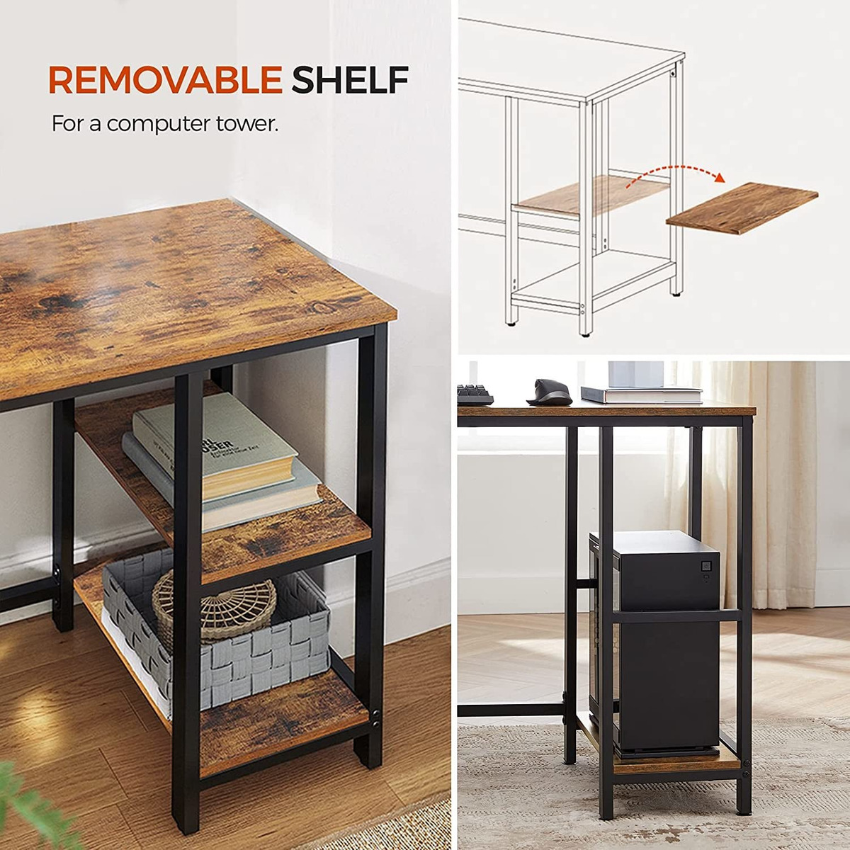 Estilo confiable: este duradero escritorio de computadora en forma de L unifica un marco de acero firme con una atractiva mesa marrón rústica para una exhibición encantadora; colócalo en tu oficina en casa con la confianza de que has hecho la elección correcta; Ajuste perfecto: ambos lados de este escritorio de estudio ahorran espacio tienen la misma longitud, por lo que es fácil de colocar en casi cualquier rincón de oficina. La esquina trasera está cortada para permitir que los cables vayan donde necesiten, ideal cuando se utiliza como un escritorio de juegos para gestionar cables de consolas; Todo al alcance: mantén todo lo que necesitas en el trabajo al alcance de la mano. Este escritorio esquinero viene con 2 estantes para mantener tus archivos y libros a mano. Como opción, el estante superior se puede quitar para hacer espacio para una torre de computadora; Montaje sin esfuerzo: sigue los pasos de montaje claros y las instrucciones fáciles de entender con piezas numeradas y obtendrás tu escritorio de computadora listo sin mucho esfuerzo para su trabajo principal, un lugar donde tus ideas brillantes cobran vida; Objetivo principal: estabilidad: el marco de acero con un bastidor adicional debajo de la mesa y 2 paneles de aglomerado superiores duraderos, este inmejorable equipo trabaja juntos para ofrecerte un escritorio estable y duradero que está listo para soportar todas tus necesidades de configuración WFH Todos nuestros productos estan en inglés SKU 91221014676
