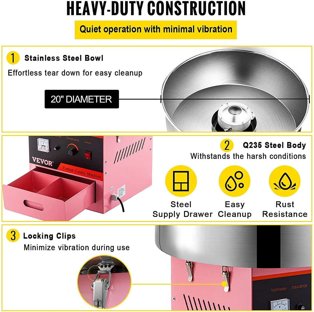 Meet Your Commercial Demands: Equipped with 900-watt heating power and a 35-watt robust motor, our commercial cotton candy machine can work continuously and cost only 30 seconds to yield one cotton candy. The high-performing spinning head holds 4 oz. of floss sugar to avoid repeatedly refilling and ensure efficient operation.; Simple Operation with Temp Control: Unlike the common ones, our electric candy floss maker features a temperature control knob. If you want to try different flavored sugars, you will absolutely need this. Using this machine couldnt be easier. Simply turn on the power, adjust the temperature (338-482F), let it warm up for 5-6 minutes, and within minutes delicious cotton candies are done.; Reliable Structure Easy Cleanup: Thanks to the stainless steel and heavy-duty steel construction, our cotton candy floss maker can withstand the rigors of high demand. The stainless steel bowl owns a large diameter of 20 inches, which is quite easy to be removed, making cleanup a breeze at the end of the event. Besides, the locking clips help hold down the bowl to minimize the vibration, making the operation quiet and smooth.; User-Friendly Designs: The electric commercial cotton candy machine comes with a built-in steel supply drawer. It helps provide extra storage space for cotton candy cones/sticks or floss sugar packs. It keeps your supplies always within your reach during your use and streamlines your operation. Besides, a handy sugar scoop is included to make your sugar-pouring incredibly easy.; Work with Any Candy You Like: This cotton machine allows you to use the traditional flossing sugars, milk sugars, fruit cubes, or any of your favorite hard candies to make delicious cotton candies. With a compact size, it is suitable for countertop use, and it is perfect for carnivals, festivals, birthday parties, and sports events. Todos nuestros productos estan en inglés SKU 91221040209