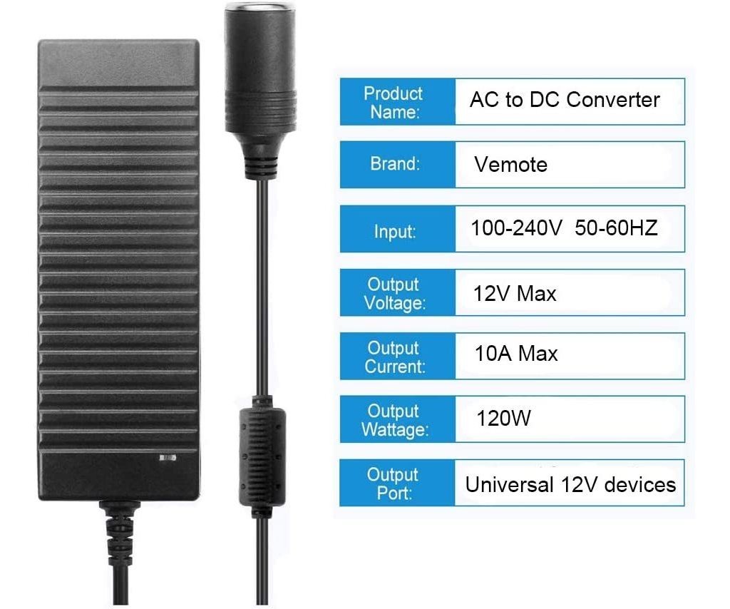 Uso universal de 12 V: 120 W/12 V 10 A fuente de alimentación transformador 100 V 240 V a 12 V encendedor de cigarrillos, le permite utilizar cualquier dispositivo de 12 V en cualquier lugar de la casa o en viajes por carretera.; Conveniente: conecta el convertidor a una toma de corriente para reproducir tus dispositivos portátiles. Máxima potencia de salida 120 W/10 Amp compatible con la mayoría de los dispositivos de coche, tales como compresores de aire portátiles, ventilador de coche, refrigeradores y refrigeradores de coche, aspiradoras, cámara de salpicadero, purificador de aire, etc.; Seguro: aprobado por la FCC, protección contra cortocircuitos, protección contra sobrecorriente, protección contra sobretensión, protección contra sobrecarga, protección contra sobrecalentamiento.; Alta calidad: esta fuente de alimentación está hecha de ABS ignífugo/resistente a altas temperaturas.; Dimensión: el cable de CC está ajustado al cuerpo del convertidor, el cable de CA se puede reemplazar. Cable de CA: longitud: 3.3 ft, longitud del cable CC: 3.3 ft. Largo x ancho x alto: 6.7 x 2.6 x 1.6 in. Compré nuestro adaptador de CA a CC. Cuando necesites utilizar un accesorio de coche de 12 voltios dentro de tu casa o fuera de un coche/RV.