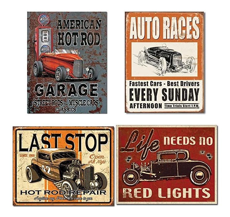 Cartel de chapa (reproducciones) El paquete incluye :; Leyendas de América del coche de carreras – 12.5 «W x 16» H; Auto razas Vintage – 12.5 «W x 16» H; La última parada del coche de carreras Reparación – 16 «W x 12.5» H; La vida no necesita luces rojas – 16 «W x 12.5» H Todos nuestros productos estan en inglés SKU 15042026068