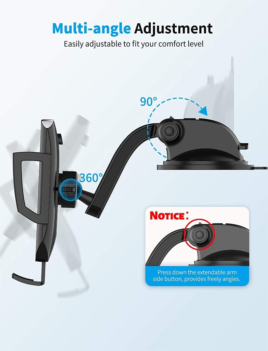 Soporte de teléfono para salpicadero de coche: con el ajuste de ángulo flexible, fuerte potencia de ventosa, el soporte de teléfono para coche mantendrá los teléfonos firmemente. Una gran opción para la mayoría de los coches, camionetas, SUV, camiones, taxis.; Visualización óptima de conducción: este soporte para teléfono móvil tiene una articulación esférica altamente flexible de rotación de 360 que proporciona ángulos de visión infinitos, ya sea en horizontal o conveniente navegación, llamadas y música en el vehículo.; Operación con una sola mano: el soporte para teléfono para salpicadero de coche cuenta con un botón de liberación rápida, coloca tus teléfonos en el soporte y aprieta los brazos de sujeción de nuevo, el soporte para teléfono celular para coche mantendrá el dispositivo de forma segura sin vibrar y tambalearse incluso en carreteras difíciles.; Adherencia superior: aprieta el aire en la ventosa, cuenta con una capa de gel pegajoso y una palanca de bloqueo que puede mejorar la estabilidad del soporte del teléfono celular para coche. Es reutilizable y lavable, simplemente enjuaga en agua y deja secar al aire para restaurar la adherencia. Almohadilla 3M extra para una superficie desigual o textura rugosa.; Amplia compatibilidad: las abrazaderas laterales ajustables se extienden de 5 a 3.8 in, compatible con la mayoría de smartphones con pantallas de hasta 7.0 in. El soporte de teléfono Vioy para salpicadero de coche es adecuado para la mayoría de los teléfonos móviles, como iPhone 12/SE 2020/11/11 Pro/11 Pro max /xs max/xr/8 plus/8/7/6s plus, Samsung Galaxy S20/S20/S20 ultra 5G/Note 20/10 plus/9/9/9/S10/S10 9/a10e, Google Pixel 3a/4 XL, LG v20, One Plus y más. Todos nuestros productos estan en inglés SKU 91221081116