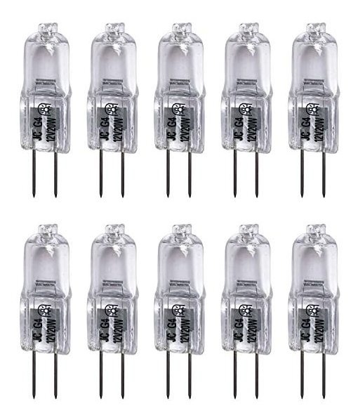 (10) x JC Tipo G4 Lámpara halógena 12V 20W; Base: G4 Claro Bi-Pin Base (4 milímetros entre Pins); Tipo: JC halógena: Potencia: 20W; Larga Vida: Aprox. 2.000 horas de vida útil lámpara; Uso versátil: aplicables para el hogar, oficinas, restaurantes y tiendas Color: 20w 10pack