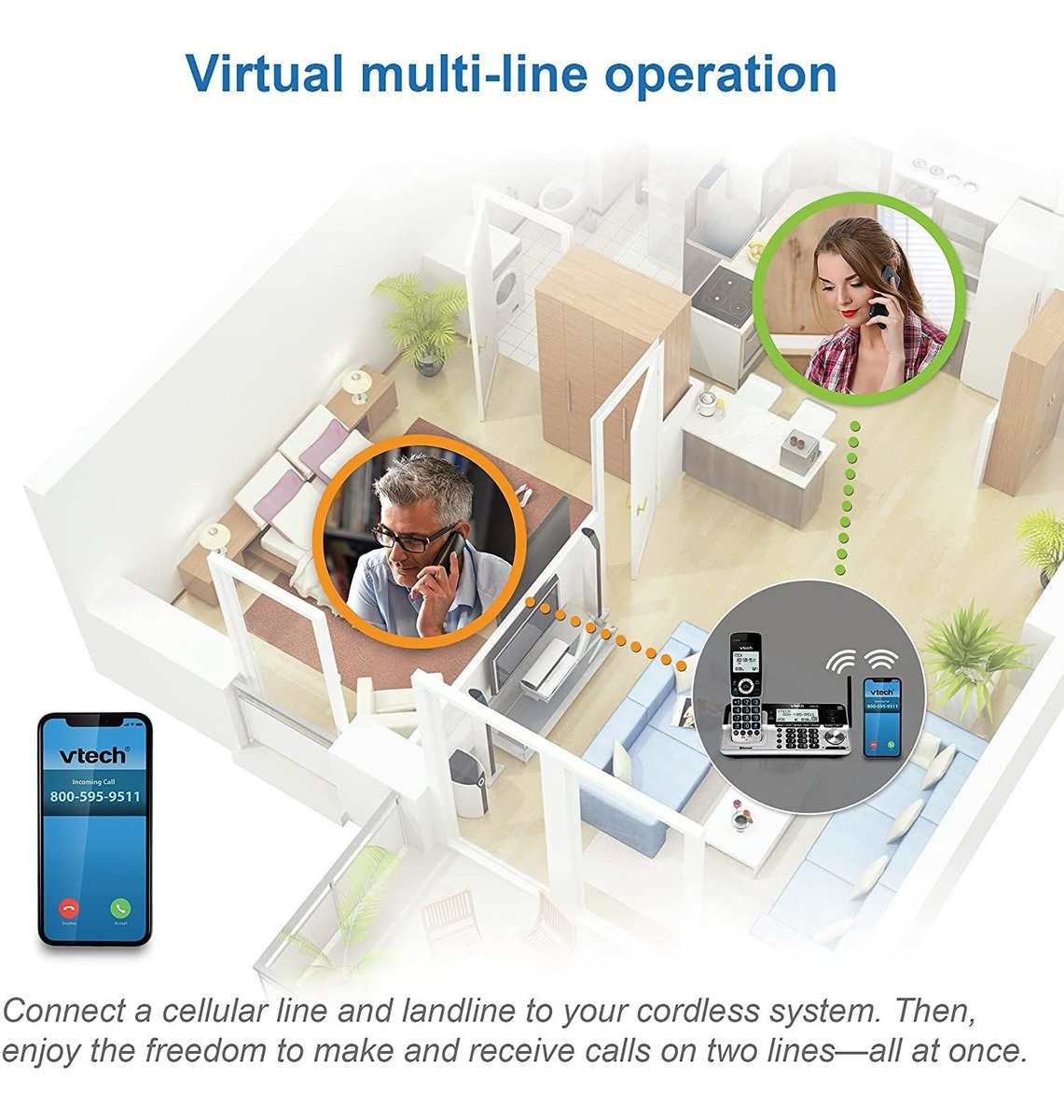 Rango extendido y conectarse a la celda: experimenta la cobertura y claridad de largo alcance, proporcionada por un diseño único de antena y avances en tecnología de filtrado de ruido. hacer y recibir llamadas desde tu plan celular mientras disfrutas de la comodidad de un teléfono en casa. Conecta hasta 2 teléfonos móviles y conecta 2 teléfonos móviles o un teléfono celular y un auricular Bluetooth para usar con llamadas fijas.; Bloqueador de llamadas inteligente: este sistema te permite bloquear llamadas molestas en el lugar con un solo toque. Lo que es más, puede filtrar llamadas de robos y llamadas no deseadas mientras permite que las llamadas de bienvenida entrada. Para la pantalla de robocalls, configúralo para pedir a las personas que llamen la tecla de libra. Para visualizar llamadas desconocidas, configúralo para pedir a las personas que llaman graben sus nombres y pulse la tecla de libra. Después de que tu llamador complete la solicitud, el teléfono suena y anuncia el nombre de la llamada. A continuación, puedes elegir bloquear o contestar la llamada, o transmitir la llamada al sistema de respuesta.; Sistema de respuesta digital con guía de voz: este fiable sistema inalámbrico incluye una contestadora digital que puede grabar hasta 22 minutos de mensajes entrantes, anuncios salientes y notas, y un indicador de mensaje LED que te permite saber el número de mensajes recibidos. Una guía de voz integrada puede ayudarte a configurar el sistema fácilmente.; Pantalla grande en HS y base, texto grande, teclado iluminado texto de alto contraste y fuente ampliada en la pantalla extragrande en el teléfono y la base hace que sea fácil leer el identificador de llamadas entrantes o registros del historial de llamadas. Además, el teclado con botón grande iluminado permite un fácil marcado en condiciones de poca luz. Esta característica es especialmente útil para aquellos que tienen problemas visuales.; Anuncio de identificación de llamadas: la visualización de llamadas nunca ha sido tan fácil. el teléfono y la base anuncian el nombre de la llamada, por lo que no tienes que buscar el teléfono para ver quién está llamando.; Altavoz dúplex completo y empuja para hablar, disfruta de un altavoz que puede mantenerse al día con tus llamadas. el altavoz dúplex completo en el auricular y la base permite que ambos extremos hablen y se escuchen al mismo tiempo. Y con el botón de pulsar para hablar en el teléfono y la base, este sistema se dobla como un walkie-talkie para comunicarse al instante con hasta cuatro unidades a la vez. Tamaño:3 Handsets