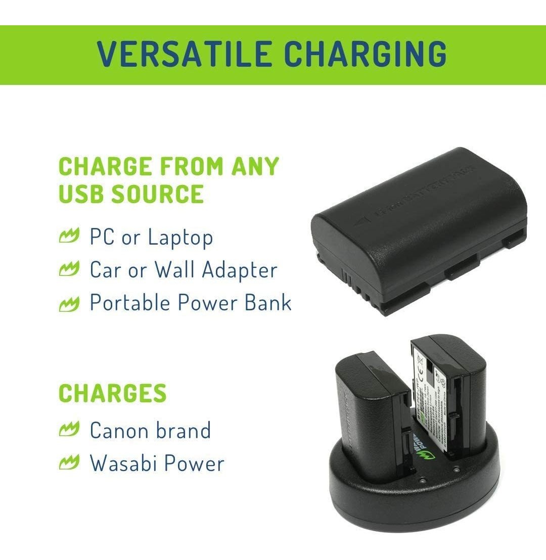 Incluye 2 Baterías y 1 cargador USB doble para el Canon LP-E6 Para Que siempre tengas la potencia Que Necesitas .; Las Baterías INCLUYEN Celdas de grado A de Alta Calidad con Una Clasificación de 7. 2 V, 2600 mAh para Mayor Tiempo de Funcionamiento y Duración de la Batería; Las Baterías Funcionan con el cargador originales de Canon .; Entrada del cargador: 5 V, 2000 MA; Salida del cargador: 8. 4 V, 600 mA (x2); El Cargador Funciona con las Baterías originales de Canon .; con Compatible Canon EOS 5D Mark II, 5D Mark III, 5D Mark IV, 5DS, 5DS R, 6D, 6D Mark II, 7D, 7D Mark II, 60D, 60Da, 70D, 80D, EOS R, XC10, XC15 .; Todos los Artículos INCLUYEN ONU Fabricante de 3 años. Este kit de potencia Wasabi LPE6 incluye 2 baterías y un cargador USB dual. Todos los artículos cumplen o exceden los estándares OEM y vienen con una garantía del fabricante de 3 años. Necesita un paquete de baterías Canon LP-E6N Coge una batería de alimentación Wasabi LPE6 para su Canon EOS R actual!