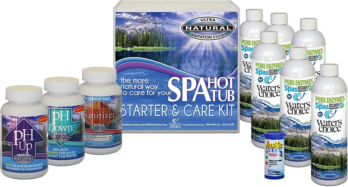 Kit de inicio de spa natural con 6 tratamientos de enzimas mensuales; Seguro, potente y fácil de usar: te ahorra tiempo y dinero; Minimiza el uso de cloro y elimina la necesidad de otros productos químicos agresivos; Contiene enzimas: el ingrediente más importante para un spa impecable y natural; Viene con todo lo que necesitas para mantener tu spa durante 6 meses Sistema de saneamiento ultra natural para spa, kit de arranque de enzima (suministro de seis meses) Este kit incluye todo lo que necesitas para poner en marcha y cuidar tu bañera de hidromasaje, todo en una sola caja. Simplifique las rutinas de mantenimiento de la bañera de hidromasaje con Waters Choice. La opción de agua Pure Enzymes es una mezcla única de enzimas que mantienen su agua de spa limpia, clara y suave. Con este producto puedes reducir drásticamente la cantidad de cloro que usas en tu bañera de hidromasaje y eliminar la necesidad de otros productos químicos agresivos. Deje atrás los días de productos químicos irritantes y de olor fuerte y pase más tiempo disfrutando de su spa. Usando las enzimas Waters Choice dejará tu agua, piel, nariz y billetera con una sensación estupenda. Los kits de sistema de saneamiento ultra natural Waters Choice están disponibles en un suministro de un mes, tres meses, seis meses y siete meses y le proporcionan todo lo que necesita para una bañera de hidromasaje limpia, saludable y natural. Para usar – Vierta una botella completa de nuestras Pure Enzymes para Spas en su spa una vez al mes. Use pH Up y pH Down según sea necesario para ajustar el pH (mantenlo entre 7.2 y 7.6). Use desinfectante según sea necesario. Contenido del kit: 6 – 12 oz enzimas puras para spas 1 – 20 oz. PH Increaser 1 – 20 oz. Reductor de pH 1 – 16 oz. Tiras de prueba desinfectante (50 tiras) Instrucciones para usar enzimas Waters Choice. Más beneficios incluyen lo siguiente: las bombas, calentadores y chorros durarán más tiempo. Los filtros no se obstruyen, lo que resulta en un mayor flujo de agua y circulación. Las almohadas y fundas no se deteriorarán tan rápidamente. Todos nuestros productos estan en inglés SKU 15092108837