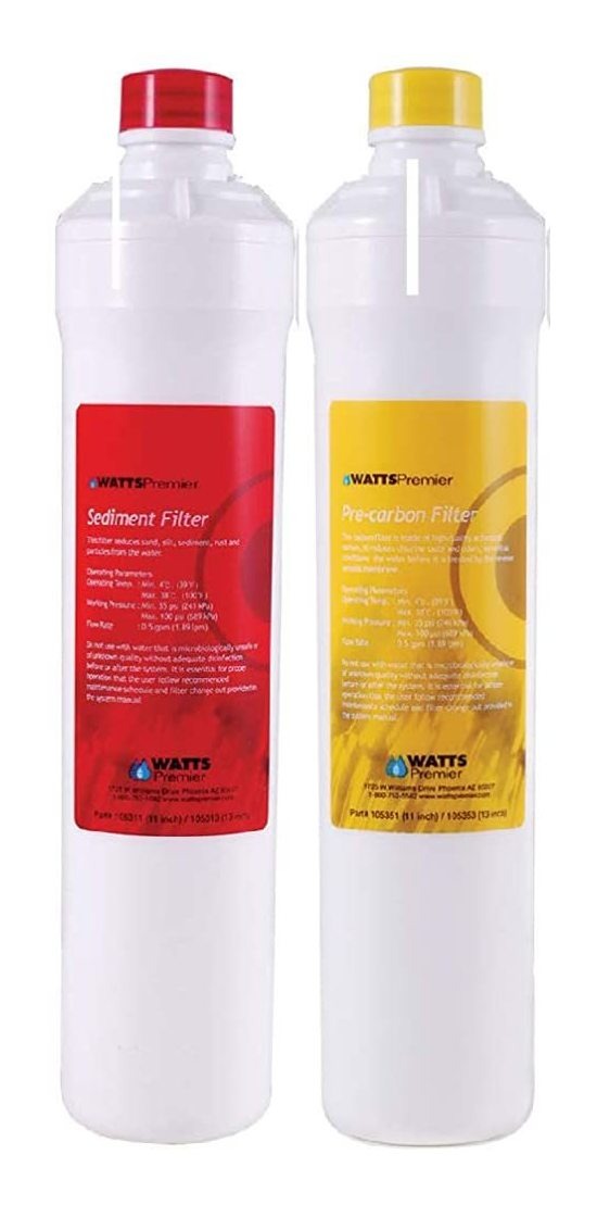 Diseñado para su uso con RO de Watts Premier puro (531407, 531411), RO Pure Plus (531.417) o cero Pure Plus (531517) Sistemas de Osmosis Inversa .; Kit contiene un 5 Micron sedimentos pre-filtro (105,311) y un 5 Micron de carbono pre-filtro (105,351) hecha de carbono de alta calidad activado; Cambie fácilmente a cabo filtros con un comunicado de botón pulsador; El pre-filtro de sedimentos reduce la suciedad, sedimentos y restos de óxido que afecta el sabor y la apariencia de su agua .; El prefiltro de carbón reduce el sabor y olor a cloro y también las condiciones de agua antes de que se trata mediante la membrana de ósmosis inversa. El kit de filtro de agua pura / Pure Plus reemplazo de Watts Premier RO es compatible con tu Cuatro Etapa RO puro, puro RO Plus o sistema de ósmosis inversa cero Pure Plus. Este kit incluye: Uno – Cinco Micron sedimentos pre-filtro (105311) que las trampas de sedimentos y otras partículas como suciedad, sedimentos y restos de óxido que afecta el sabor y la apariencia de su agua. Uno – Cinco Micron bloque de carbón pre-filtro (105351), que ayuda a asegurar que el cloro y otros materiales que causan mal sabor y olor se reducen considerablemente. Si estás en busca de cambiar sus 6 meses Filtros, este kit es perfecto para sus necesidades. Todos nuestros productos estan en inglés SKU 12062109417