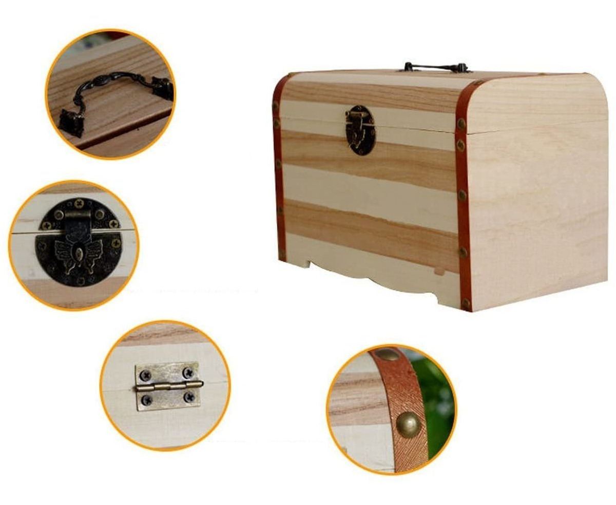 Caja de dinero de ahorro inspirado en los diseños antiguos con una tapa en forma de cúpula con cierre plegable que puede acomodar una pequeña cerradura; El diseño retro portátil para facilitar la movilidad, cerradura con forma de mariposa hace más delicada, con ribete de remache retro y elegante, antideslizante diseño de fondo fácil de proteger .; El banco de ahorro de dinero es de madera, que tiene dos colores diferentes. Grano de madera será diferente, oscura o clara debido a la textura; Tenemos tamaño tres diversa para que usted elija. Pequeño: 17.3x13x12.1cm / 6.81×5.12×4.76inch; Medio: 19.7x15x14.6cm / 7.76×5.91×5.75inch; Large: 25×15.4x18cm / 9.84×6.06×7.09inch; Esta caja de monedas de dinero compacto de madera es ideal para guardar dinero, pasaportes, joyas, arma de fuego con seguridad, y mucho más, también es el regalo perfecto para las niñas, niños y adultos Todos nuestros productos estan en inglés SKU 6102017435