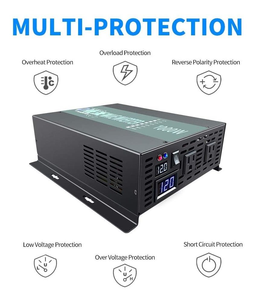 Potencia continua: 1000 W. Potencia de sobretensión: 2000 W. Voltaje de entrada: 12 V CC. Voltaje de salida CA: 120 V. Forma de onda: onda sinusoidal pura. Frecuencia: 60 Hz. Tipo de enchufe: enchufe de Estados Unidos y fila de cableado.; Dos años. Siempre estamos aquí para ayudarte.; Componentes incluidos: inversor de corriente, cable, fusible, manual de usuario (idioma español no garantizado).; Pantalla LED tanto para voltaje CC como para voltaje CA, lo que hace que sea claro para el usuario. Alta eficiencia por encima del 90%.; Protección de corte de sobrecarga. Protección de corte de cortocircuito. Protección de corte de bajo voltaje. Protección de corte de alto voltaje. Protección contra sobrecalentamiento.; Rendimiento fiable ya que el inversor de potencia de 1000 W tiene un buen grosor de PCB de 2. 0.000 in, lo que permite que la corriente flote en el circuito, aumenta la capacidad de carga.; Transformador de alta frecuencia transfiere CC a CA, y garantiza la salida de CA estable y completa.; Todos los Mosfets de gran marca con gran capacidad de conducción.; La inducción de cobre auténtico de alta calidad filtra la forma de onda, garantiza la verdadera salida de onda sinusoidal pura, protege tu equipo.; Las protecciones de inversor de potencia incluyen protección de corte de entrada de alto voltaje, protección de alarma de bajo voltaje, protección de sobrecarga, protección de sobrecorriente, protección de sobretensión, protección de conexión inversa y protección contra cortocircuitos por fusible. .; Como la fábrica profesional de inversor de onda sinusoidal pura de diez años, nuestro objetivo es proporcionar a todos los clientes inversores de alta calidad y a fondo después de un servicio al cliente seguro. 1000W 12VDC to 120VAC 60Hz Pure Sine WAVE inverter is produced by Yueqing Reliable Electric Co. , Ltd. , which is a specialized in in the R/D and production of the pure sine WAVE inverter for 8 years. The power inverter is CE FCC approved. We have strong power conversion engineering team and make the unique design of the inverter both inside and outside. And we it is 1000W full power, pure sine WAVE inverter with high efficiency and low failure. We develop the most sophisticated and stable design in software and hardware. All big MOSFET are adopted inside. The most endurable electronic components are used inside. The power inverter is EMC approved, with no electromagnetic interference to your appliances such as TV, Radio, audio etc. . Todos nuestros productos estan en inglés SKU 15092101727