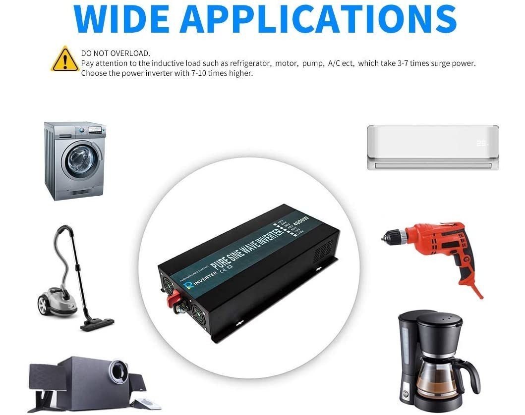 WZRELB 4000W 48V DC to 120V AC puro inversor de onda sinusoidal generador, 4000W de potencia continua, 8000W de potencia máxima, tan buena como la alimentación de red, respaldo de alimentación para la fuente de alimentación del hogar. Dos tomacorrientes.; Protección total de seguridad: sobrevoltaje, bajo voltaje, sobrecarga, cortocircuito, sobrecalentamiento, protección inversa de polaridad (fusible), protección contra fugas de electricidad.; El grosor del PCB es 2. 0.000 in, permite que la corriente más fuerte flote en el circuito, aumenta la capacidad de carga. Transformador de alta frecuencia para transferir CC a AC, garantiza la salida de CA estable y completa.; El ventilador de refrigeración inteligente integrado funciona según la temperatura y no se carga. Prolonga la duración de la batería. Es bastante silencioso y solo se enciende cuando la temperatura es de más de 68 grados Celsius.; Inductancia de cobre puro de alta calidad, filtra la forma de onda, asegura la verdadera salida de CA de onda sinusoidal pura, protege tu equipo. Todos los grandes mosfets importados con una fuerte capacidad de conducción. About WZRELB: Professional manufacturer for pure sine wave power inverter for 10 years, provide prompt reply, friendly customer service and 18-month . Product details: DC input: 24V DC input range: 21V-30V Efficiency: 85%-90% AC output: 120v Frequency: 60Hz Socket: Dual US type Low Voltage Alarm: 19. 5V-21. 5V Low Voltage Shut Down: 18. 5V-20. 5V Over Load: shut off, recover manually Over Voltage Shut Down: 30. 5V Cooling Ways: Cooling Fan will run when the temp is over 50 degree Celsius Precautions: 1. Please do not connect the inverter with the grid power, and a reverse connection of positive and negative is also forbidden. 2. Please do not overload. If your applications are inductive loads, please choose the inverters whose continuous power is 3-7 times higher than the watts of your appliances. If you want to power up a refrigerator, we suggest you use 10 times higher power inverter. 3. Please turn off the load first then turn off the inverter. And as there is a soft start function, please turn on the inverter first then turn on your loads, or the output may not stable at the first seconds. 4. For a red light flashing, it remind that the input voltage is a bit high. 5. Please use the set of standard battery cables we sent, or a full output may not be . There are build-in fuse for safety concern, the fuse come with package are just spare parts. 6. Considering transportation safety, we took off the battery of remote controller, you can buy it in your local place. Its specification is 23a 12v. Todos nuestros productos estan en inglés SKU 15092102012