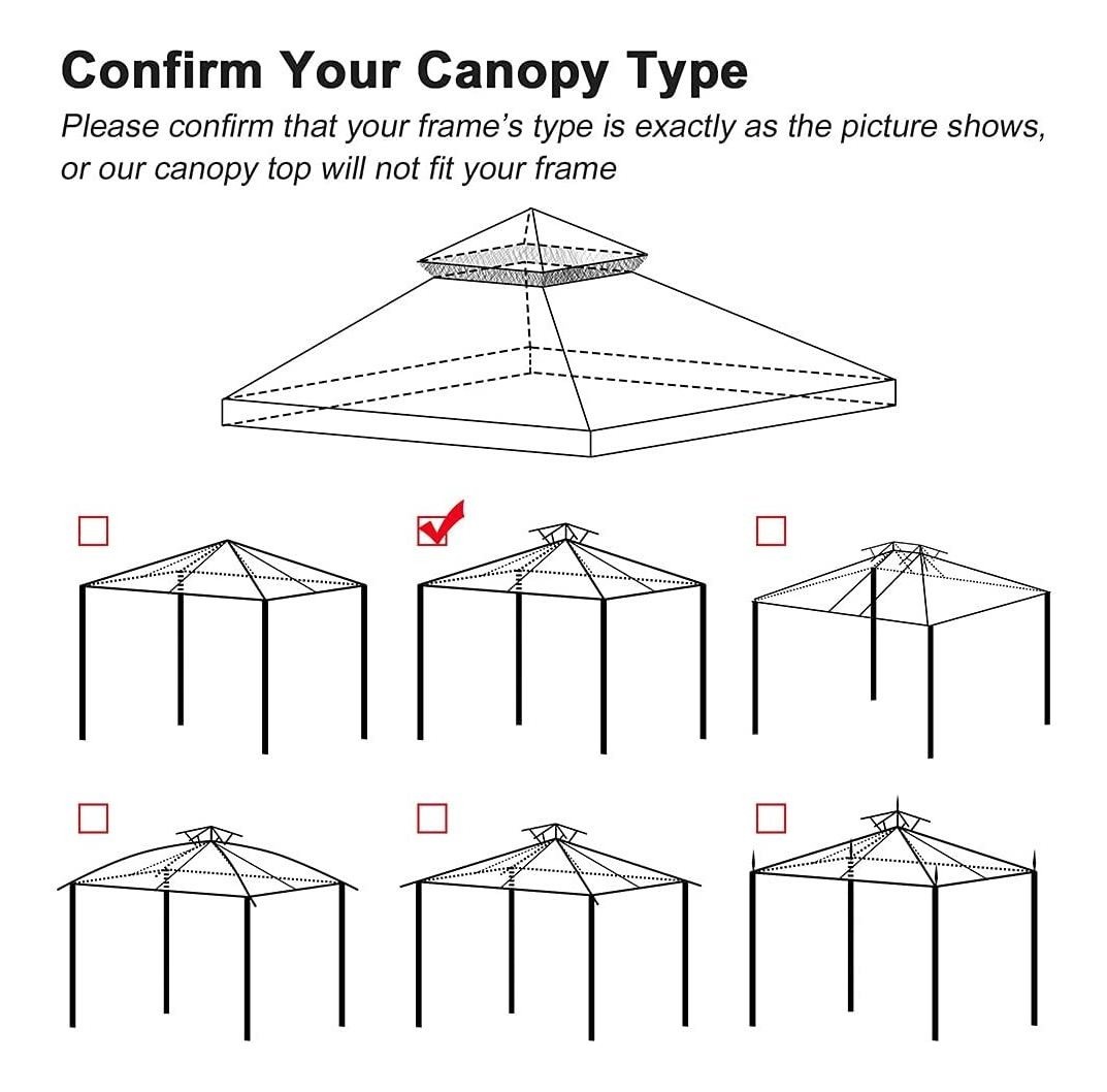 Apto para marcos de cenador de 2 niveles de 11,8 x 11,8 en .; Toldo protector de 2 Capas UV30 : capa de poliéster de 7,05 oz / m revestimiento PA .; Daninos UV Más Eficaz para bloquear los rayos; Medio año Más De Vida Que Otros toldos pecado revestimiento .; Repelente al agua, ONU crea espacio acogedor CUANDO llueve .; Parte Superior ventilada con cremallera con mosquitera Entre la parte superior, e inferior; 16 ojales para Garantizar la ONU drenaje del agua ADECUADO. CARACTERISTICAS: