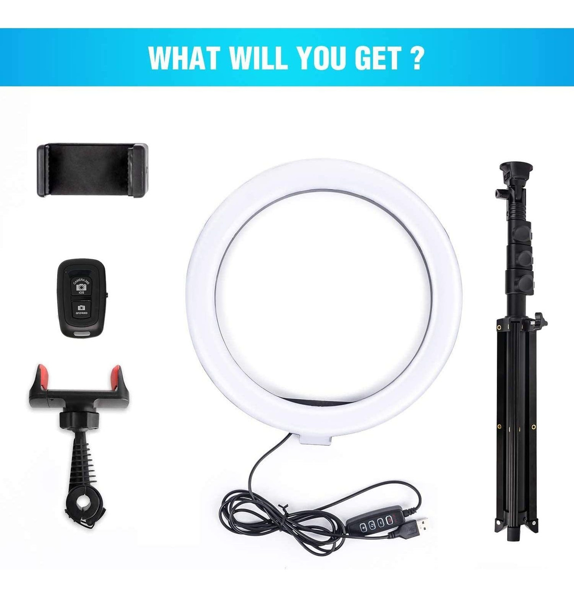 Ten en Cuenta: DEBIDO una cola HEMOS actualizado Nuestro juego de luces de Anillo de 10.2 Pulgadas, algunos adj Clientes Nos Dicen Sobre el antiguo Soporte de Teléfono PUEDE causar facilmente Que El Soporte se caiga, por Lo Que utilizamos El Nuevo Soporte para Teléfono (Instalar en El Palo) para reemplazarlo. El Nuevo Soporte para Teléfono Puede Ser compatible con teléfonos inteligentes Dentro De 3.15 Pulgadas de ancho .; Anillo de luz LED regulable: Equipado con 120 LED SMD de alta Calidad y 3 Modos de luz Diferentes (luz blanca, luz y natural de luz cálida), Suficiente brillo PUEDE embellecer tus caras. Cada Modo de Iluminación Tiene 11 Niveles de brillo ajustable, satisface Todas tus Necesidades en Diferentes Ocasiones. Es la Iluminación diurna regulable perfecta para quitar TODAS LAS sombras poco favorecedoras .; Soporte de trípode ajustable: Hecho de Aleación de Aluminio de Alta Calidad, lo Suficientemente estable para mantenerlo en su Lugar de forma segura sin el riesgo empresarial Que se vuelque. El trípode ajustable se Extiende de 16.1 en un 52,0 en el párrafo ONU Disparo Perfecto, PUEDES bloquearlo a la Longitud Deseada Como necesites, lo que hace A que sea Una Posibilidad de Ser utilizado Como un trípode de mesa plegable o ponerlo en el piso. El trípode también Se Puede Como utilizar Como un palo autofoto y trípode de cámara GoPro, es Bueno Para Llevar con Tu Viaje .; Alimentado por USB y Mando a distancia: Funciona con Varios puertos USB, Como portátil, PC, Fuente de Alimentación, USB cargador, adaptador de CA, etc. Longitud del Cable de Alimentación up to 78.0 adentro, es perfecto para la Iluminación en tu estudio , maquillaje en tu vestidor, camping, transmisión en vivo, etc. Con mando a distancia Bluetooth, deja tus Manos Libres para Tomar fotos .; Lista de Paquetes y servicio: (1) 1 anillo de luz LED de 10.2 Pulgadas (2) 1 Soporte de trípode ajustable (3) 1 Soporte para Teléfono Celular (4) 1 mando a distancia Bluetooth para selfie, (5) Manual de Usuario (idioma español no garantizado). Si Tiene Alguna PREGUNTA, please Pongase en Contacto con Nosotros un Través de Amazon o envie Correo electrónico. Todos nuestros productos estan en inglés SKU 4022160519