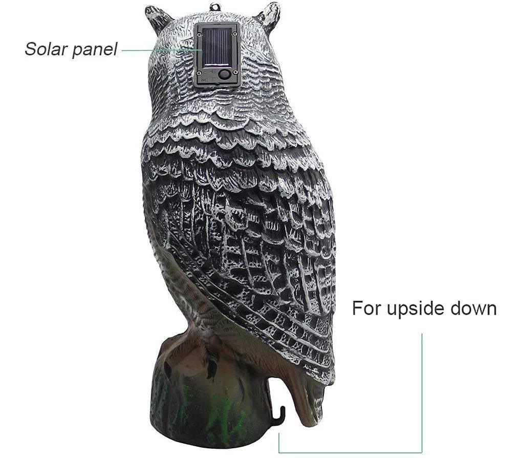 Funciona con energía solar: el espantapájaros absorbe automáticamente la energía solar a través de los paneles solares, por la noche los ojos del búho se iluminarán automáticamente para mantener alejados a los pájaros, ardillas y otros seres vivos destructivos.; Solo tienes que poner el búho en un lugar visible como un árbol o arbusto. El búho tiene un anclaje en la parte inferior y se puede fijar en las estacas mediante tornillos (no incluidos). Ideal para el jardín, patio o porche.; Ecológico y respetuoso con la vida silvestre. Deshazte de los pájaros y los seres vivos destructivos humanamente sin dañarlos. Mide 15.7 in de alto x 6.7 in de ancho. Hecho de plástico moldeado resistente y parece muy realista, asusta a los pájaros con eficacia.; 4 maneras de instalar: solo tienes que poner el búho en un lugar visible como un árbol o arbusto. 1. El búho tiene anclaje en la parte inferior y se puede fijar en las estacas con tornillos (no incluidos). 2. El búho tiene un agujero para colgar en la parte superior para que puedas colgarlo. 3. Abre la pestaña inferior del búho y rellena con arena (no incluida). Ideal para el jardín, patio o porche. 4. Retira la cubierta inferior y fija el búho al palo.; Nota: ten en cuenta que este búho es para decoración al aire libre, que no se puede garantizar que sea eficaz para todos los pájaros. Cambia la posición del búho en todo momento para evitar que los pájaros se acostumbren a él. Satisfacción garantizada. Si tienes cualquier problema, no dudes en ponerte en contacto con nosotros. Este gran señuelo de búho tiene un fuerte factor de disuasión para pájaros de jardín con sus características y tamaño realistas.