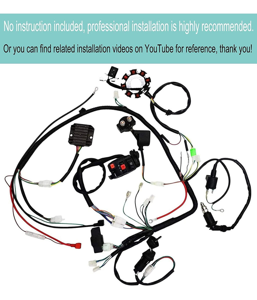 Kit completo de arnés de alambre, kit de arnés de cableado eléctrico, kit de arnés de cableado ATV se adapta a casi todos los años motor vertical de arranque eléctrico GY6 125cc 150cc ATV / QUAD / Coolster / Go Kart / 4 ruedas / Scooter / Buggy / Motowork y más.; El paquete incluye: 1 arnés de cableado GY6 de 125 cc y 150 cc, 1 CDI, 1 bujía, 1 bobina de encendido, 1 relé solenoide, 1 rectificador (regulador de voltaje), 1 interruptor de encendido (2 llaves, impermeable); 1 interruptor ATV multifuncional mejorado; 1 estátor magnético (8 polos 5 cables, 2 agujeros de fijación).; Arnés de cableado eléctrico completo de cable magnético para motor GY6 de 4 tiempos de 125 cc y 150 cc ATV Pit Bike Scooter Quad Kit completo de arnés de cableado con bobina de estátor eléctrico para ATV chino, arnés de cableado completo para GY6 150, compatible con arnés de alambre Taotao, compatible con piezas de baja ATV, y compatible con muchas otras marcas, tales como: Coolster, Kazuma, Pitpro, Hazuma, Pitpro, Hazuma, Hashpro, ummer, Xmoto, Monsoon, Trooper, Hunter, Motox, Blitz, Kawasaki KLX, Bigfoot, Kuda, Motoworks, Chongqing, Ducar.; Este arnés de cableado completo para ATV chino también puede ser conocido como kit de arnés de cableado GY6, kit de arnés de cableado GY6 de 150 cc para ciclomotor, arnés de cableado de 150 cc con estador, arnés de cableado GY6, arnés de cableado de 150 cc GY6, piezas chinas de 4 ruedas, arranque eléctrico, arnés de cableado de bicicleta de bolsillo, arnés de cableado de 125 cc. Kit Powersports WW. Arneses de cableado, arnés de cableado de ciclomotor, kit de arnés de cables para cuatrimoto.; No incluye instrucciones, se recomienda que la instalación la realice un profesional. Nota: no es compatible con 49 cc 50 cc 70 cc 110 cc 150 cc 200 cc 250 cc 300 cc Zongshen Lifan ATV / Quad con diferentes estatores. Kit completo de arnés de cableado para GY6 125cc 150cc ATV / Quad con 6 estatores de bobina.