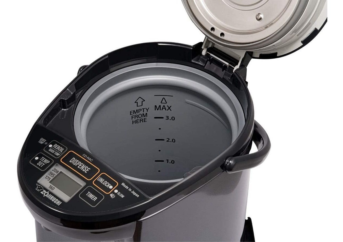 Zojirushi Micom caldera de agua y calentador tiene un micro control de temperatura computarizado y un sistema de dosificación eléctrico de un solo toque. Tiene cuatro ajustes de temperatura de mantener caliente: 160, 175, 195, 208 grados F. Esta unidad muestra la temperatura real del agua en todo momento en su pantalla LCD fácil de leer y panel de control. También tiene una función de temporizador de ahorro de energía (6 – 10 horas) y un indicador de sonido fácil de escuchar para alertar la finalización del proceso de ebullición o bajo nivel de agua. El modo de temperatura rápida calienta el agua directamente a la temperatura seleccionada mantener caliente sin llegar a hervir. El agua alcanzará el seleccionado mantener la temperatura caliente más rápido que el modo regular. Otros beneficios incluyen la reducción de vapor y el consumo de energía reducido. Este modo debe utilizarse cuando no sea necesario la cloración de DE, como cuando se utiliza agua embotellada o purificada. Para activar, pulse el botón de reboil/temp rápido; la luz de ebullición parpadeará. El modo de decloración reduce el cloro y los olores húmedos del agua del grifo extendiendo el tiempo de ebullición. El CD-NAC también ofrece un modo de dispensación de goteo de Café para una dispensación más lenta. Las líneas de nivel de agua en el interior facilitan el llenado con la cantidad correcta de agua. El exclusivo diseño de boquilla y tapa de Zojirushi ofrece un vertido suave y aerodinámico al tiempo que minimiza el goteo. El panel plano fácil de limpiar protege los componentes internos del líquido, partículas y polvo. La tapa es extraíble para facilitar la limpieza y el relleno. Todas las superficies que entran en contacto con alimentos o bebidas están libres de BPA. El compromiso de Zojirushi con el diseño seguro: el apagado automático evita que se hierva seco; el bloqueo automático evita la dispensación accidental; la protección en la boquilla y en la tapa evita fugas cuando se inclina o se vuelca o gotee después de la dispensación. Todos nuestros productos estan en inglés SKU 91221012913